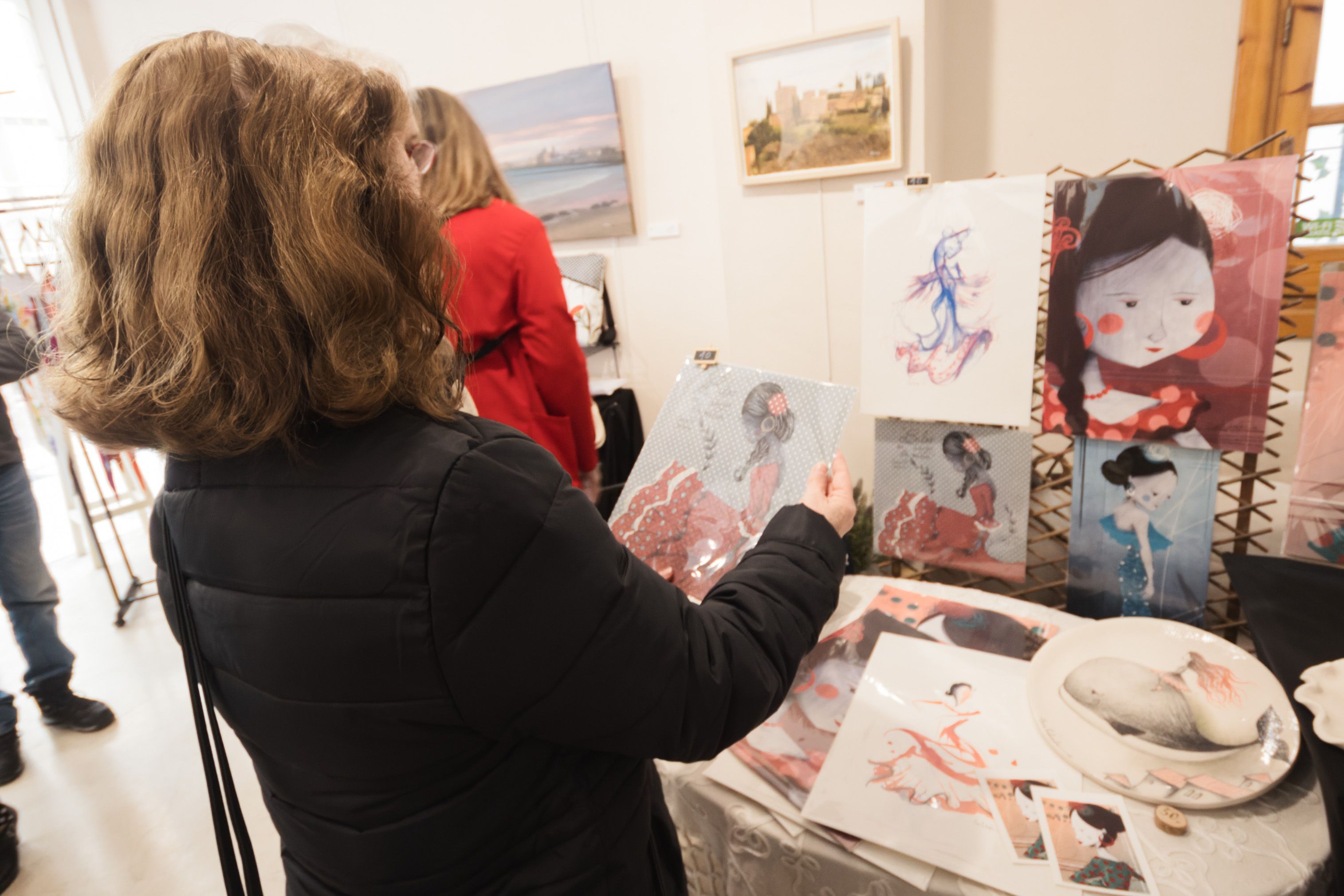 De las telas a los dibujos. Junto a la mesa de Lola está el espacio de Sara Gabandé, madrileña afincada en Jerez desde hace 19 años que enfocó su carrera en el mundo editorial. La disciplina de esta licenciada en Bellas Artes es la ilustración, donde se mueve como pez en el agua. El estilo flamenco no prima en su obra, pero sí lo ha tocado en alguna ocasión. “Cuando me vine a esta ciudad me entraron ganas de hacer flamencos. Hago muchas figuras femeninas y decidí hacer flamencas de diferentes colores”, cuenta.