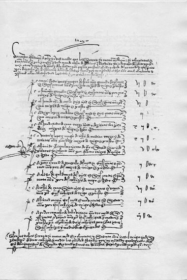 Es decir, se trata de un abasto de 60,5 cahices de trigo, por valor de 79.860 maravedíes, hecho por varios jerezanos una década antes de la fecha del documento real. 60,5 cahices de trigo que serían unos 30.000 kilos de trigo aproximadamente, es decir un kilo de trigo aproximadamente a 2,50 maravedíes. No son muchos kilos si se tiene en cuenta que esta expedición pudieron ir más de 1.000 personas y 17 naves. Y además, en el documento se lee, al inicio del fº 2, que ya otros vecinos de Jerez habían prestado y recibido dinero por aporte de trigo para lo mismo. O sea, fueron más de 30.000 kilos de trigo los que salieron de Jerez para abastecer esta flota del almirante Colón. Llama mucho la atención un retraso de nada menos que diez años por parte de la reina en pagar a los jerezanos que aún no habían cobrado: “Proveído a Pedro Camacho de Villavicencio quatro mill e seysçientos e veynte maravedís por tres cahizes e medio que prestó para cumplimiento de diez cahizes por que los otros seys cahizes y medio le están pagados”