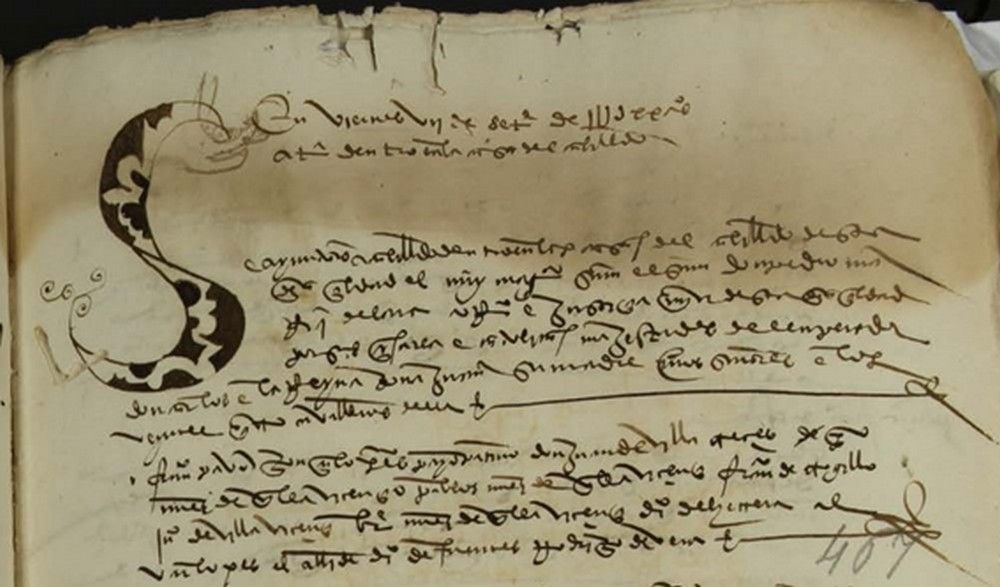 Es muy infrecuente encontrar una letra capital de estas características iniciando un acta capitular de Xerez. Pero esta divertida letra serpiente se encuentra dibujada en la de 7 de septiembre de 1520. El texto dice así: