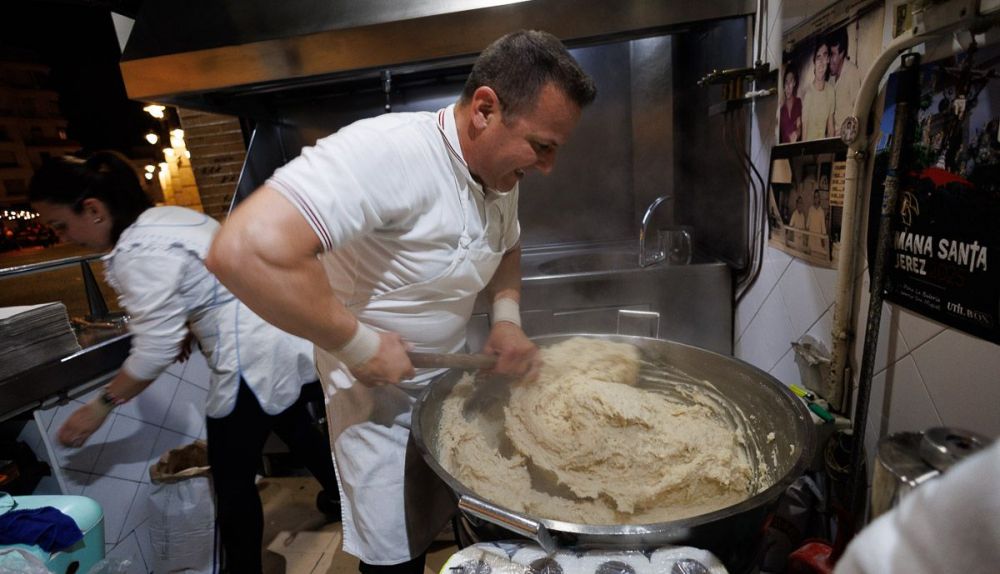 María prepara el puesto de Doña Blanca como en las últimas ocho Madrugadas de Viernes Santo y Antonio amasa, repasa con la pala y va poniendo aceite a hervir. Son 400 kilos de masa de churros en un puesto "que tiene el tiempo que tiene La Plaza, 140 años". Señala su antigua ubicación junto al mercado central de abastos, pero sin dejar de amasar en ningún momento. "Me ahorro el gimnasio y el crossfit", confiesa. "Déjate de crossfit que luego vienen los divorcios", arremete con sorna su mujer, calentando motores ante la cola de clientes que en poco más de una hora se les vendrá encima.