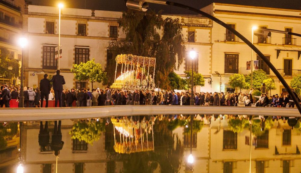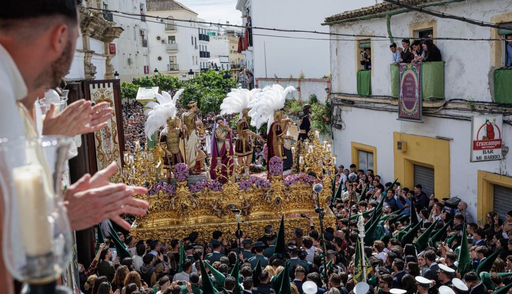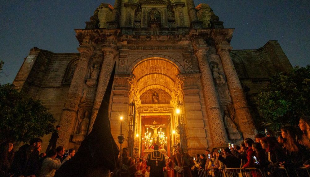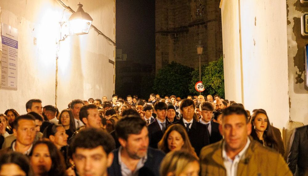 Con el alumbrado público apagado adrede para aumentar la mística de la salida, los acentos extranjeros se entremezclan con el murmullo de cada vez más público. El siseo acaba con el ruido, pero no con los flashes inoportunos, con las pantallas con luz azul que interrumpen uno de los grandes planos secuencia de la película de la Semana Santa de Jerez. Un largometraje que se repite cada año, pero siempre con un guion distinto.