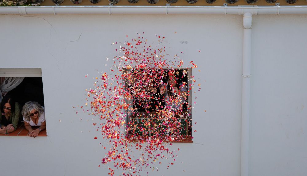 Un manto de pétalos desde una ventana de La Plazuela para Nuestro Padre Jesús de la Sentencia.