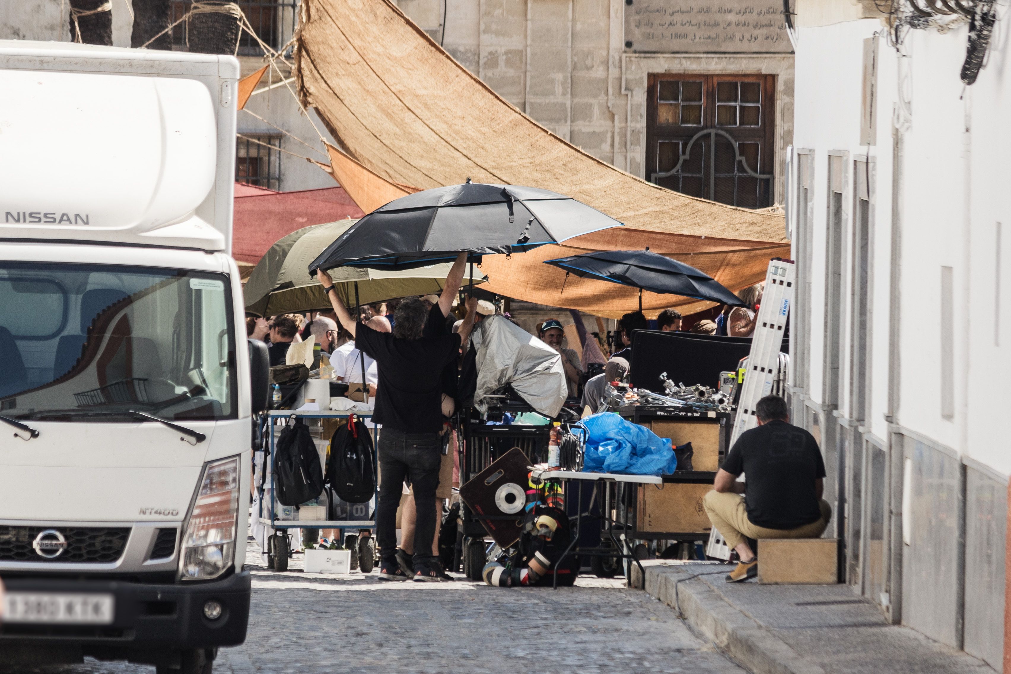 Pértigas de sonido, cámara, monitores, cableado, vehículos de producción, de maquillaje, de vestuario, jaimas, figurantes con rasgos árabes y también occidentales … y toda la parafernalia inherente al mundo del cine, así como todo el atrezzo necesario para ambientar este histórico enclave como un mercado árabe de Casablanca (Marruecos).