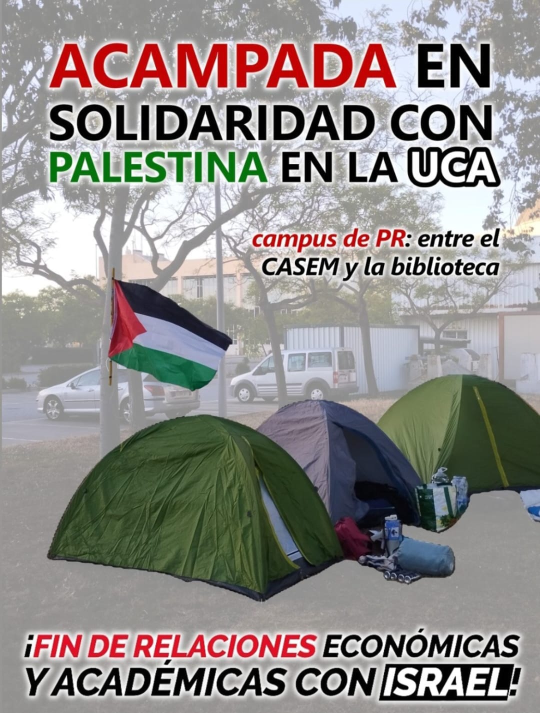 Un grupo de estudiantes de este centro ha convocado su acampada para reclamar el fin de las relaciones académicas con Israel en el Campus de Puerto Real de la UCA. En concreto, los universitarios están llamados a asentarse en el espacio existente entre el Centro Andaluz Superior de Estudios Marinos (Casem) y la biblioteca, según una imagen compartida en redes sociales.