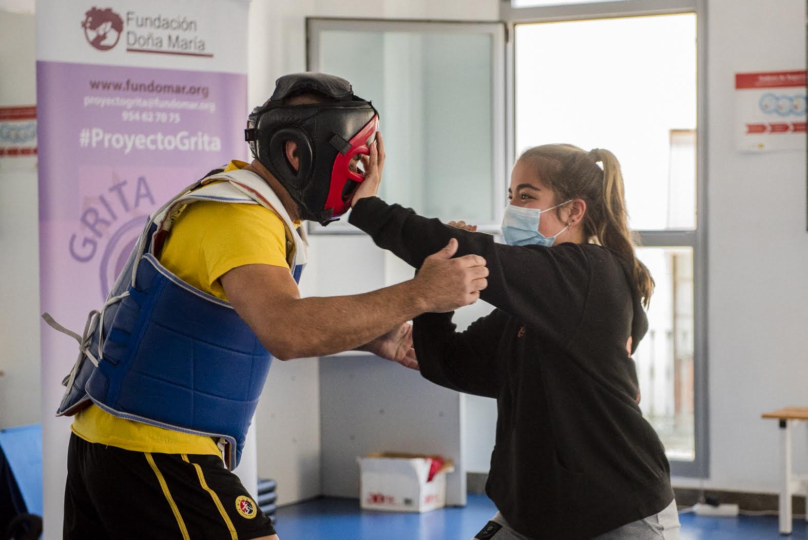 El Proyecto Grita facilita estas dinámicas con el fin de erradicar la violencia sexual, a través de diferentes áreas de actuación centradas en el fomento de un pensamiento crítico entre la población joven sobre los modelos de masculinidad y feminidad sexistas, el análisis de las formas de violencia dentro de las relaciones y la activación de la conciencia y respuesta ciudadana contra estas agresiones. En este caso, un grupo intergeneracional de mujeres participan en unas jornadas gratuitas de sensibilización sobre el acoso sexual, especialmente en zonas deportivas y de ocio, con una parte práctica de recursos en defensa personal en el Centro Deportivo San Luis.