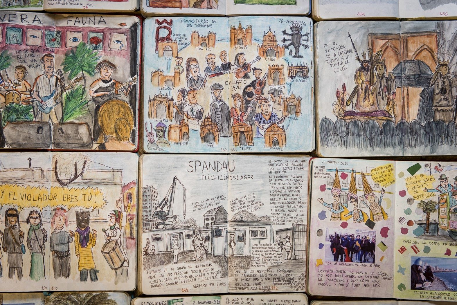 Los cuadernos de Bernar no son comics. "En una página puede salir una persona de Domingo de Ramos y en la siguiente unos colegas jugando al futbolín", comenta este dibujante que empezó en 2007 y cuenta con 30 cuadernos oficialmente dibujados, aunque sume un total 46, los 16 restantes son de otras temáticas. "Me doy cuenta de la cantidad ingente de dibujos y años que tengo dibujados, ya voy para cronista, a ver si me llaman de un periódico para dibujar diaramente", espeta Bernar, que ya tiene una persona encargada –dice– para dibujar su funeral. "Al menos que ese cuaderno tenga un final", expresa con cierta sorna. Pero mientras viva, seguirá siendo testigo de lo que pasa en Sevilla.