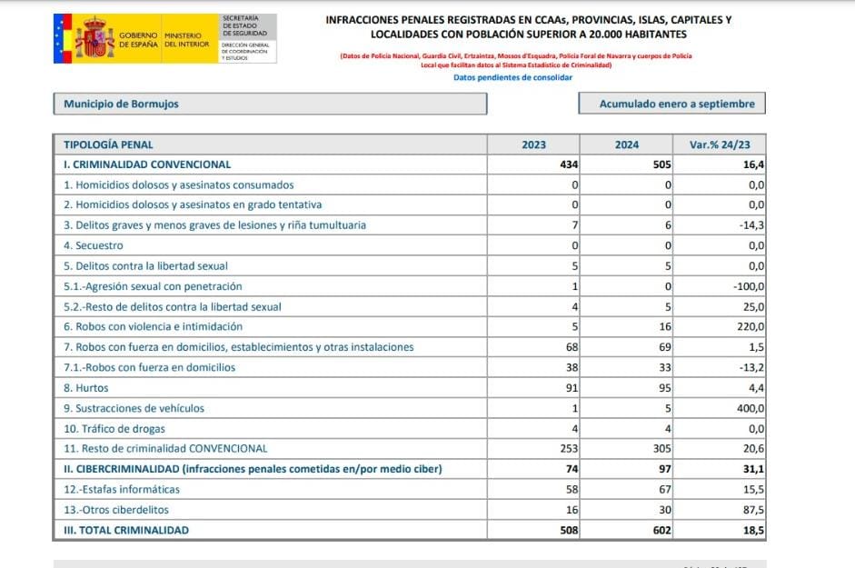 El municipio sevillano de Bormujos ha registrado un notable incremento en los índices de delincuencia, según los últimos datos del Ministerio del Interior. La criminalidad convencional y la cibercriminalidad han aumentado significativamente en el tercer trimestre de 2024, con un 220% más de robos con violencia e intimidación y un incremento del 400% en sustracciones de vehículos.