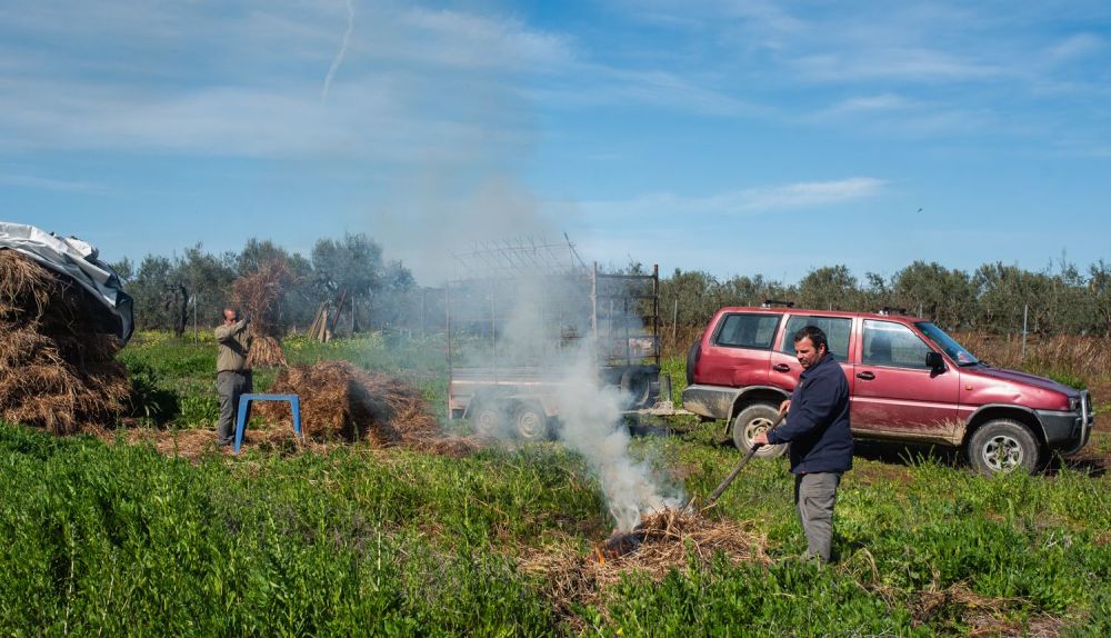El trabajo que llevan realizando 25 años en un campito entre Villamanrique e Hinojos es totalmente fordiano, repetitivo. Horas de radio bajo el frío o el calor elaborando estas mallas que luego emplearán en las chozas. Se han ganado ya ciertos descansos: los días de lluvia ya no trabajan.