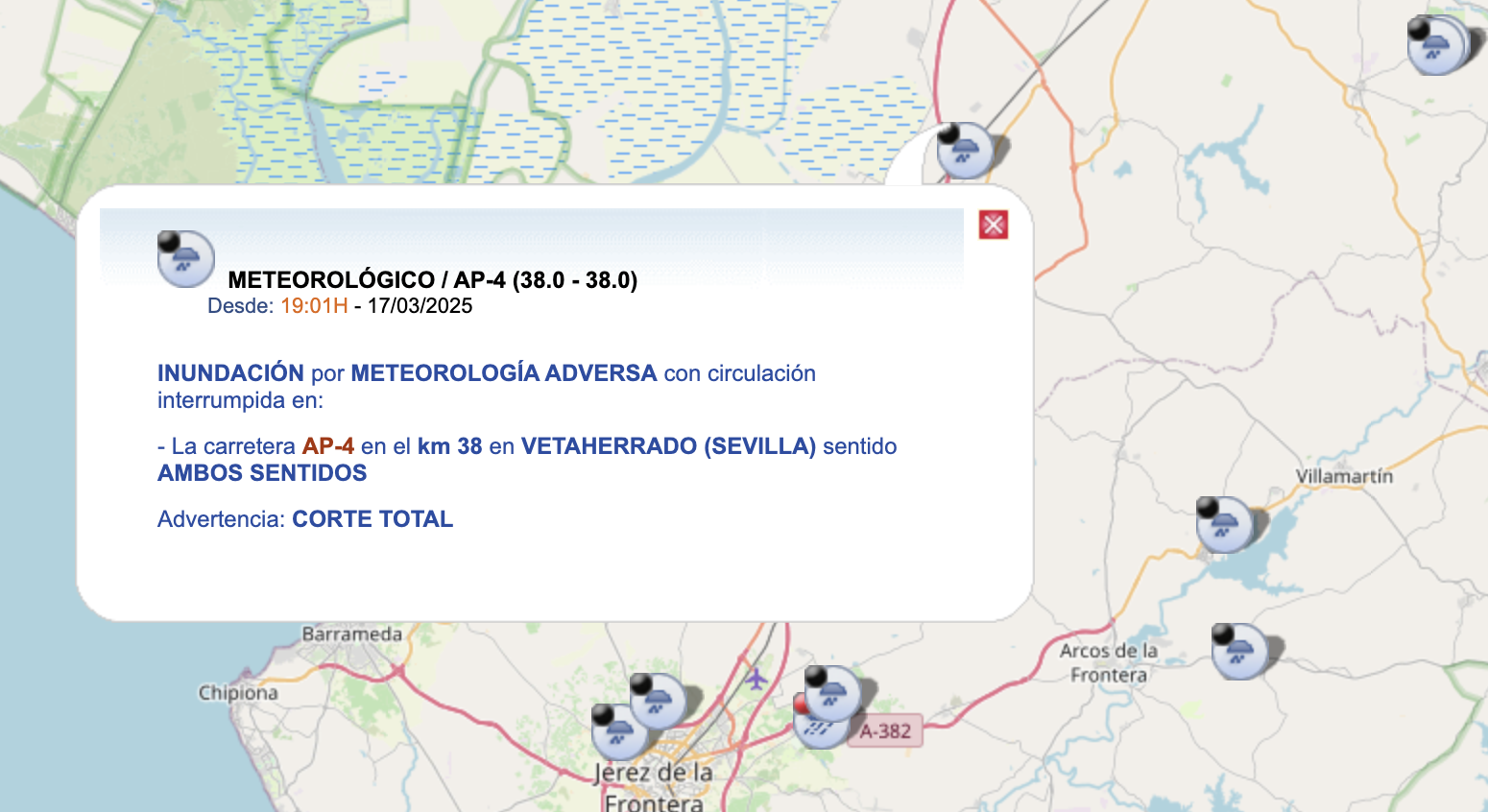 La DGT ha informado a las 19:01 horas de este lunes del corte total en ambos sentidos de la AP-4 en ambos sentidos, a la altura del núcleo de Vetaherrado, de las Cabezas de San Juan, en el punto kilométrico 38 de la autopista.
