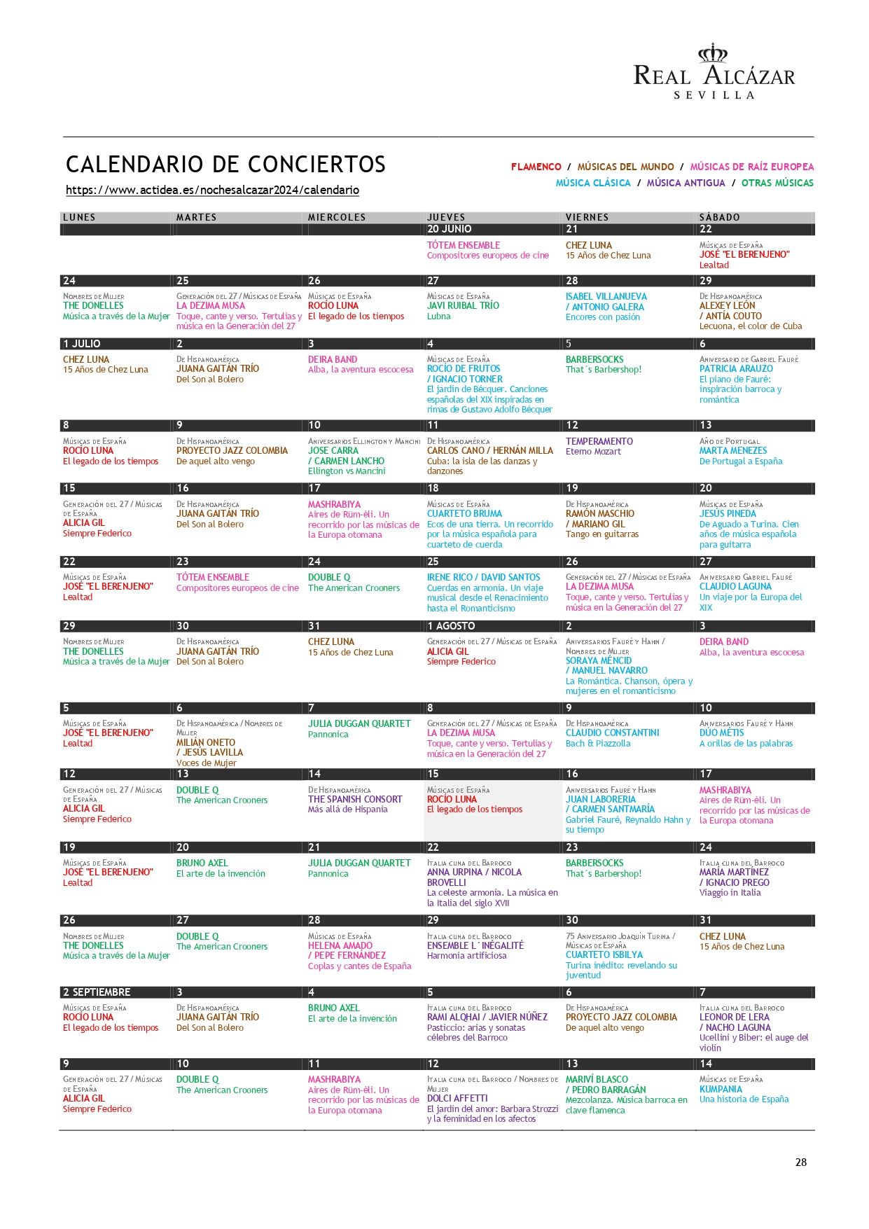 Asimismo, los conciertos harán un repaso histórico y cultural, con diferentes citas englobadas en flamenco, músicas del mundo, música de raíz europea, música clásica, antigua y otras músicas. En total, para los conciertos serán 45 grupos, de los cuales hay una mayoría de procedencia andaluza.