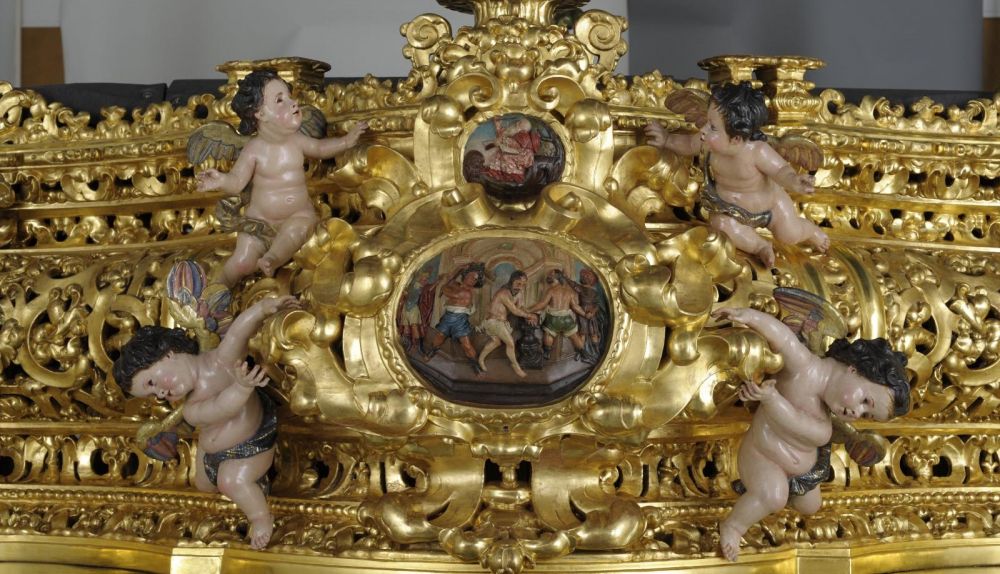 Uno de los elementos más llamativos del paso son los veinticuatro ángeles de bulto redondo que adornan la canastilla, junto a otros seis de mayor tamaño situados en los ángulos. Durante la restauración, los técnicos del IAPH realizaron radiografías que ahora se exponen al público, permitiendo observar la estructura interna de estas figuras y ofreciendo una perspectiva inédita sobre su factura artística.