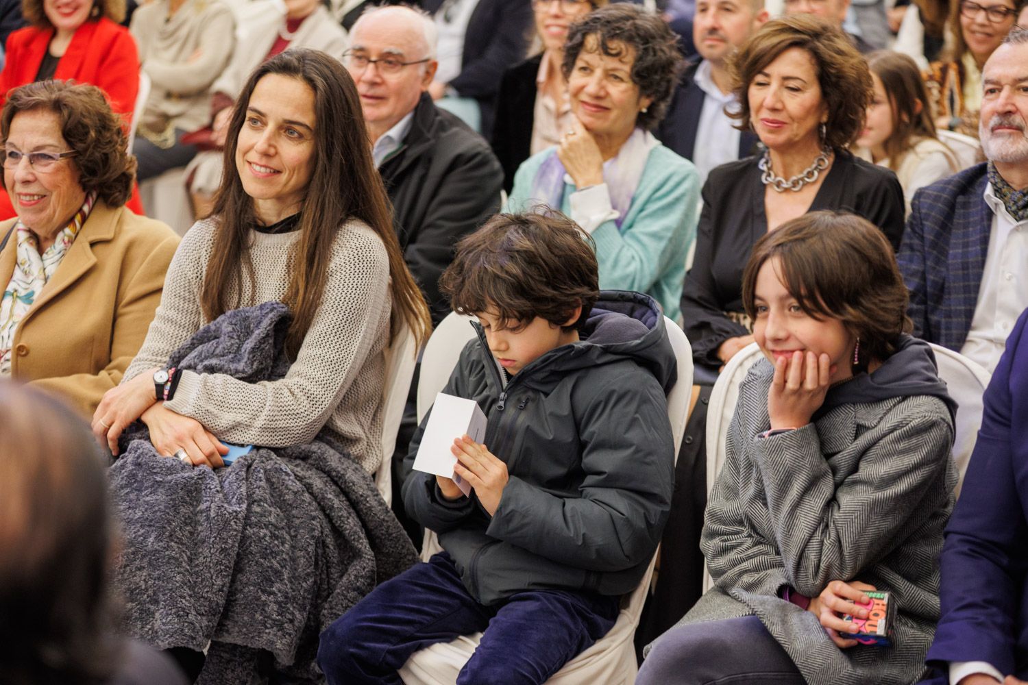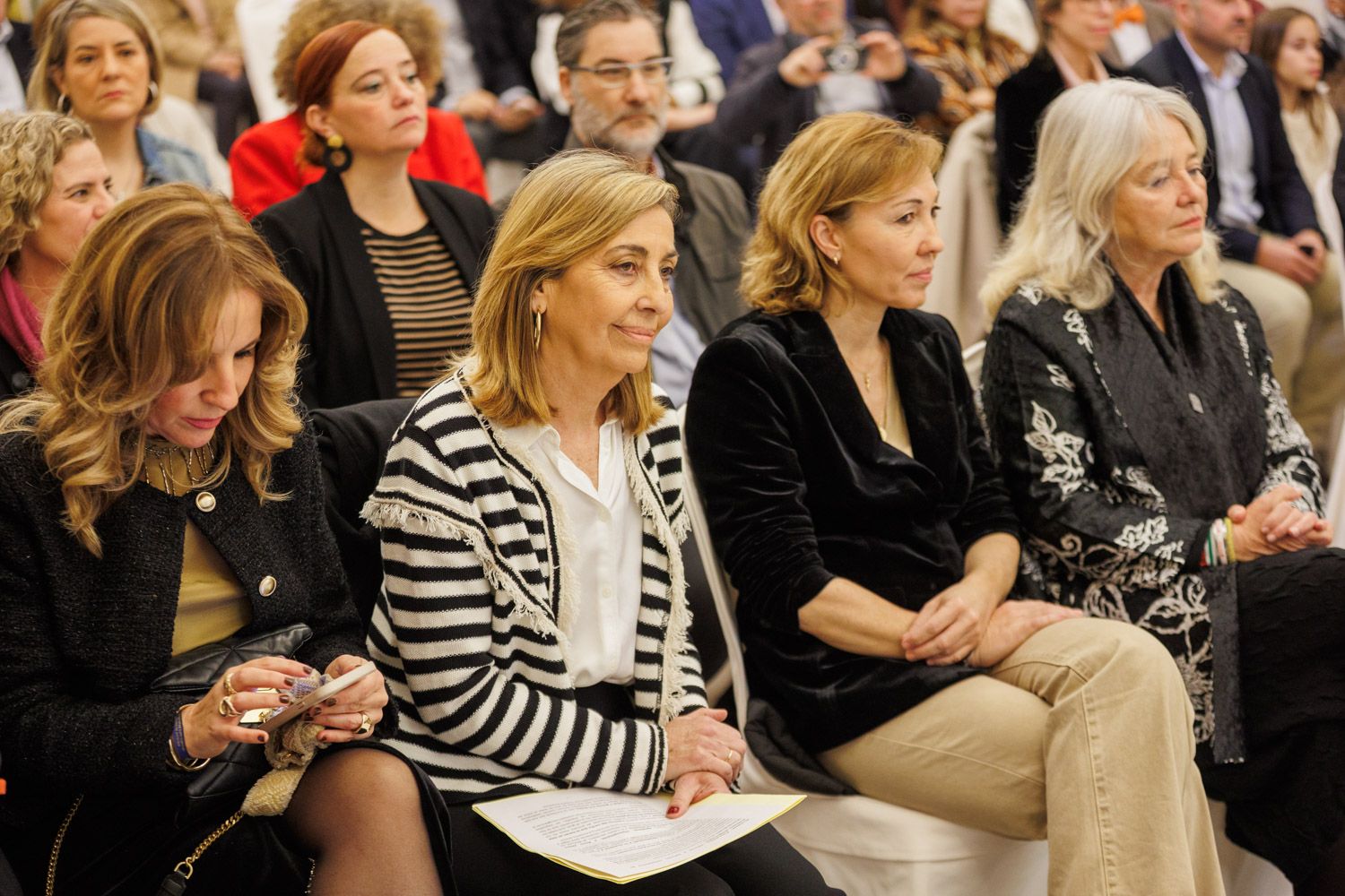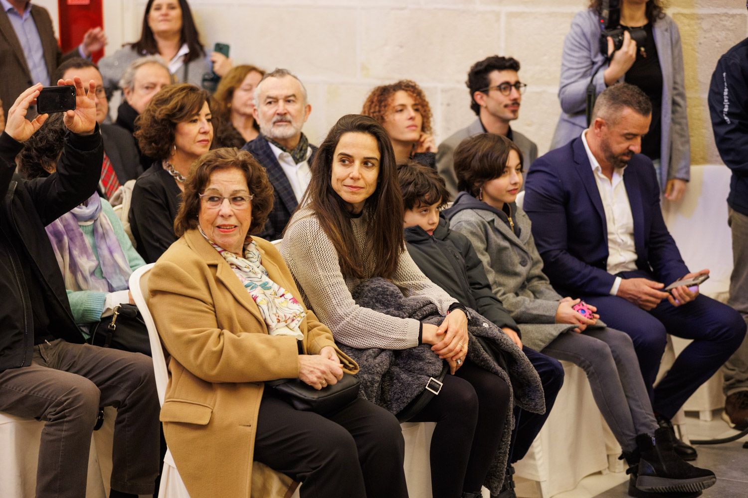 Emilio Morenatti se abraza a su madre, Rosa, en presencia de Marta, su mujer, tras el pleno extraordinario donde ha sido distinguido como Hijo Adoptivo de Jerez. Al fondo, una de las fotos de su exposición en los Claustros con sus trabajos de la pandemia por los que recibió el Pulitzer.