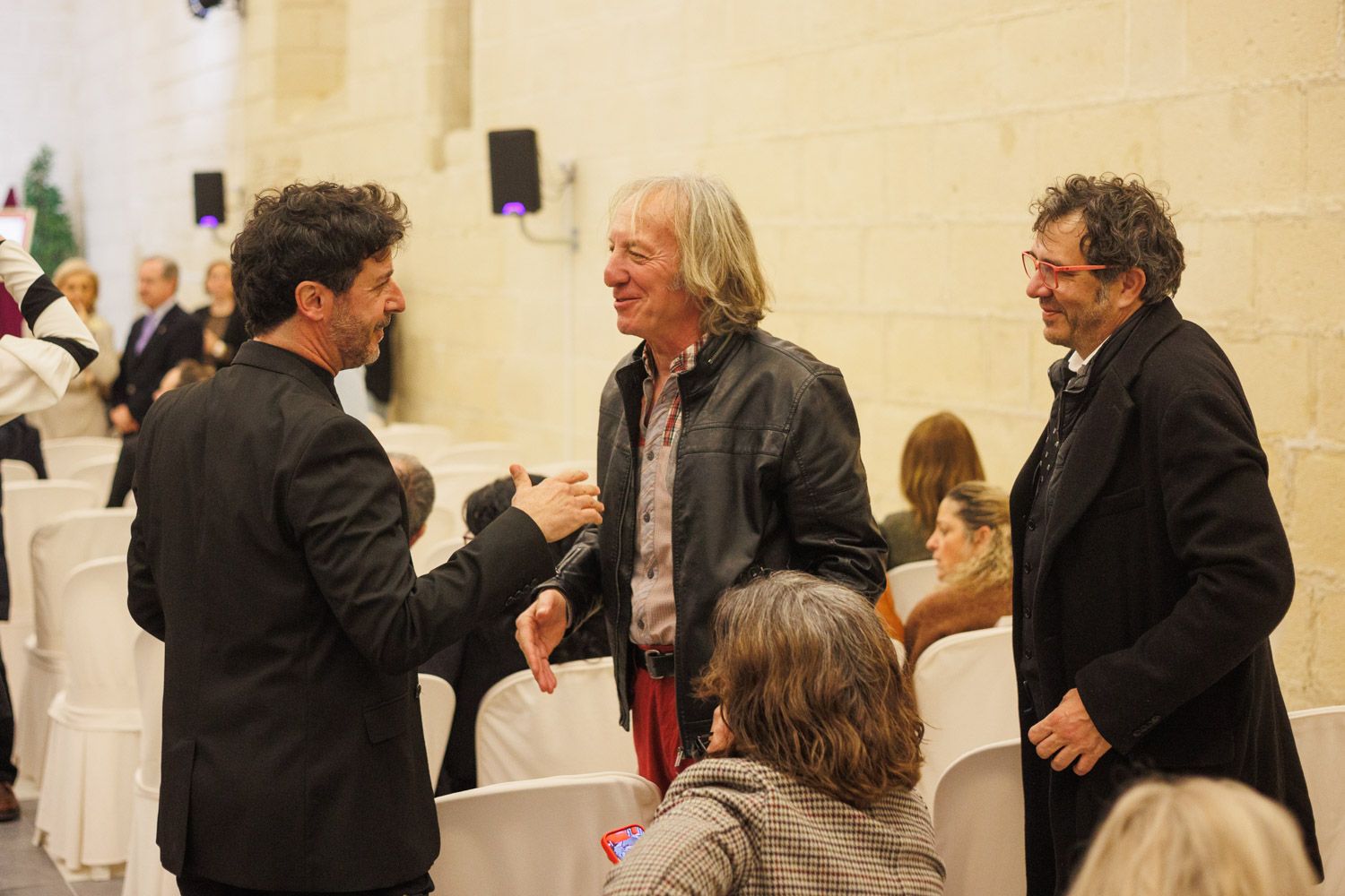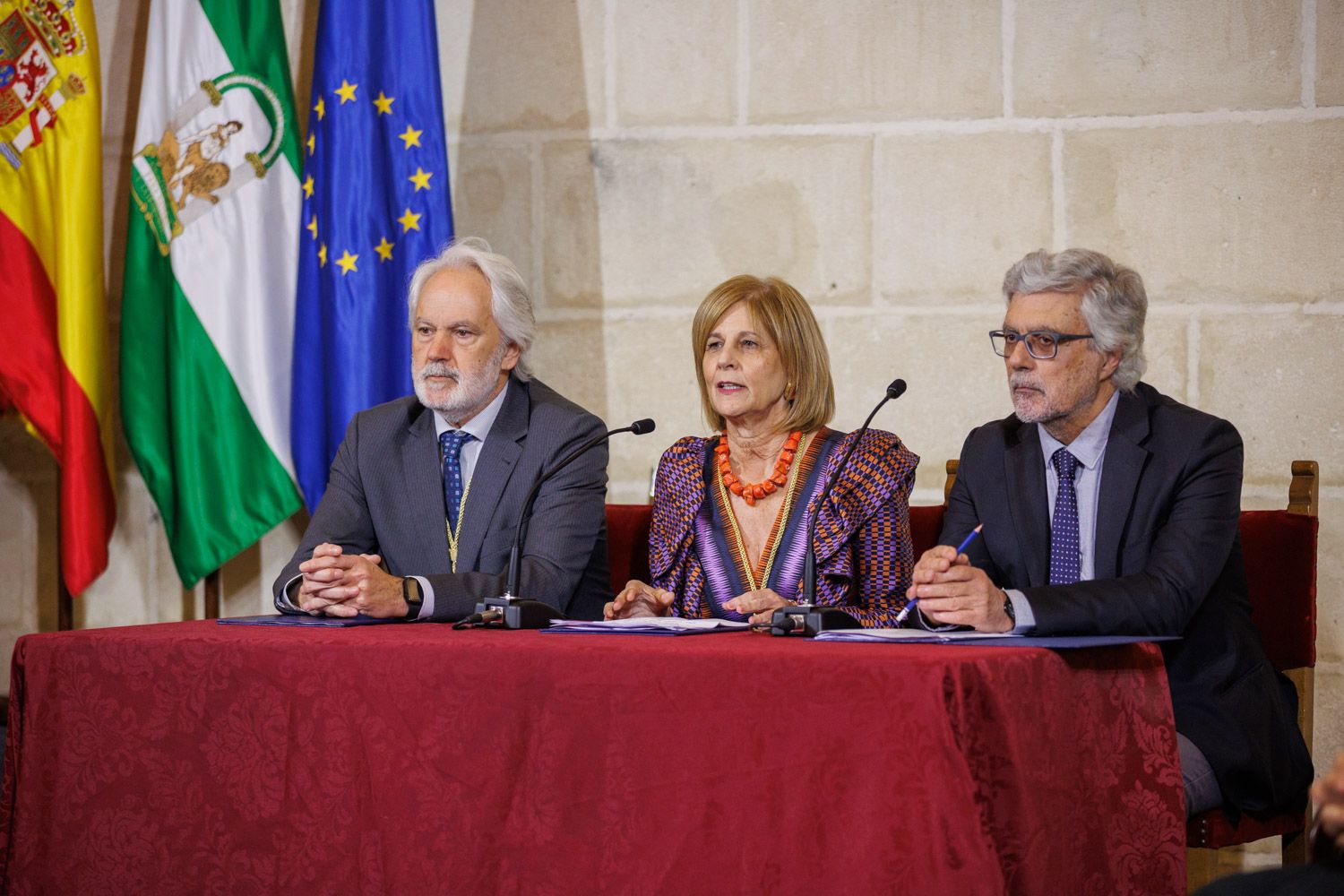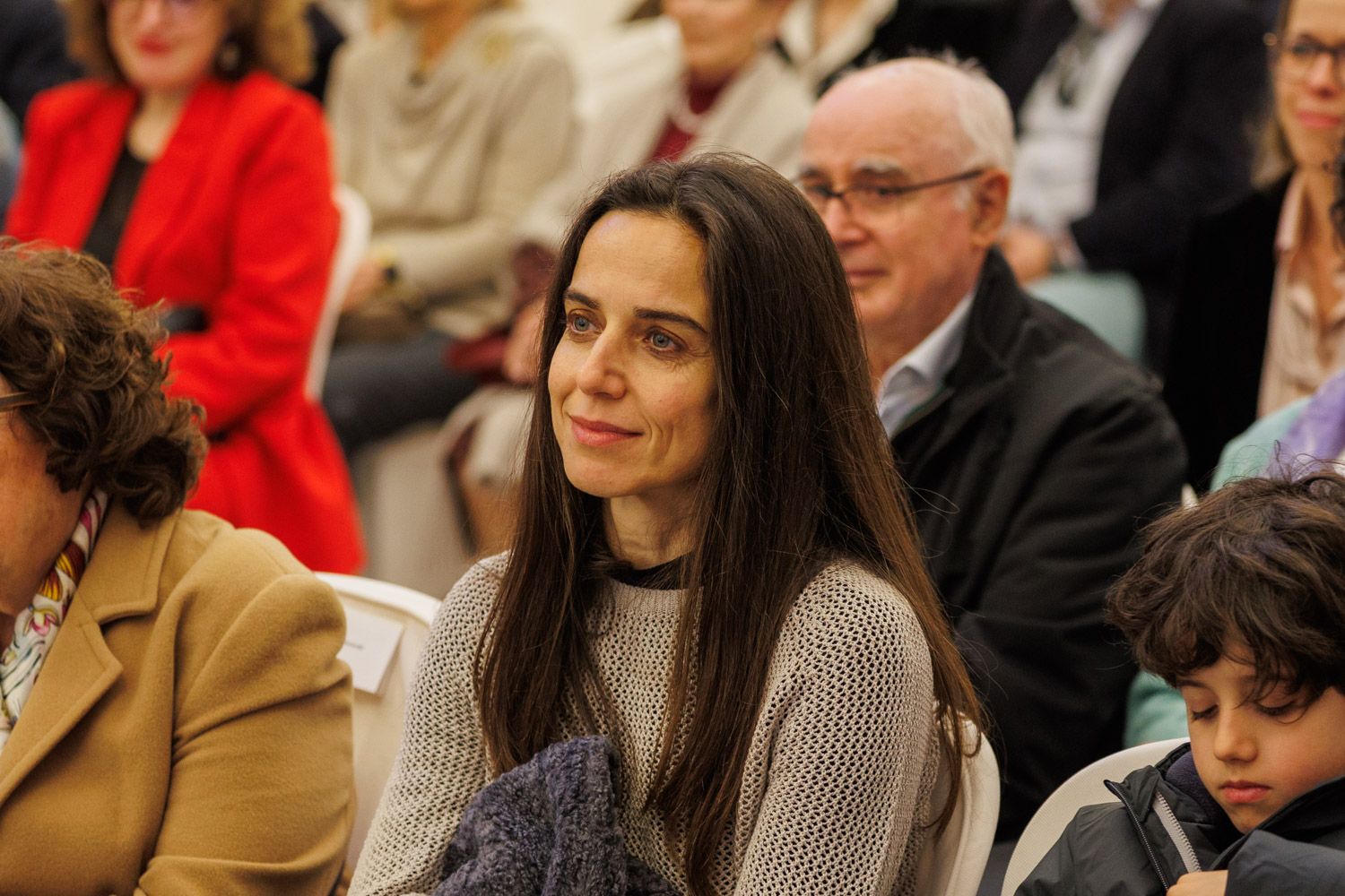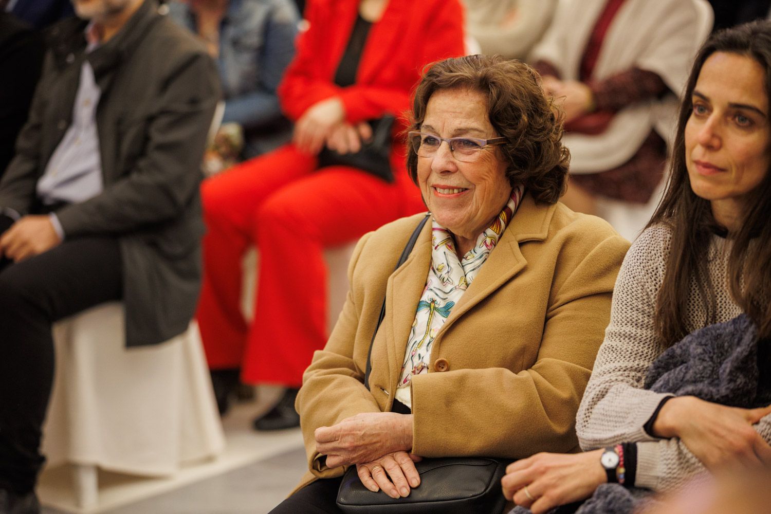 Emilio Morenatti se abraza a su madre, Rosa, en presencia de Marta, su mujer, tras el pleno extraordinario donde ha sido distinguido como Hijo Adoptivo de Jerez. Al fondo, una de las fotos de su exposición en los Claustros con sus trabajos de la pandemia por los que recibió el Pulitzer.