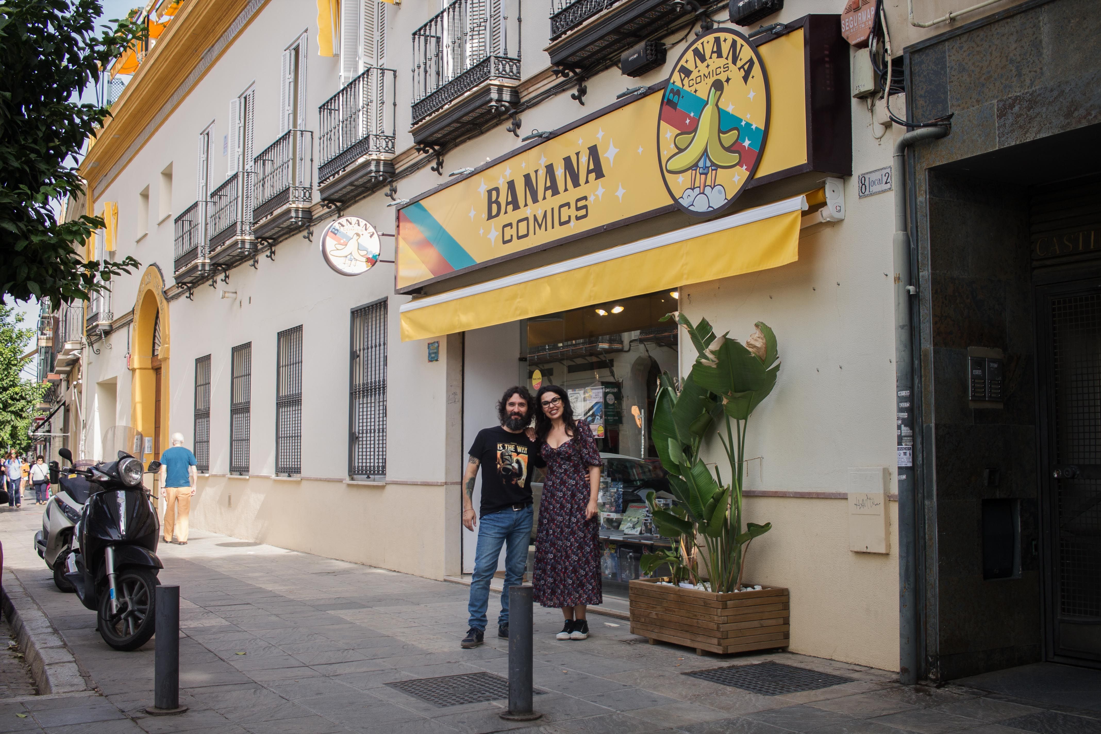 Aunque el logo no tenga nada que ver, se trata de una tienda de cómics que desde hace un año regentan José y Laura. La llegada de esta singular librería a este barrio sevillano, lejos de encontrar el rechazo de los vecinos ha provocado todo lo contrario. "Una vecina nos había dicho que estaba contenta porque habíamos puesto la imagen corporativa amarilla, como los toldos del bloque", cuenta entre risas Laura. Por redes de vez en cuando también reciben mensajes que preguntan si todo el edificio es de la tienda de cómics.