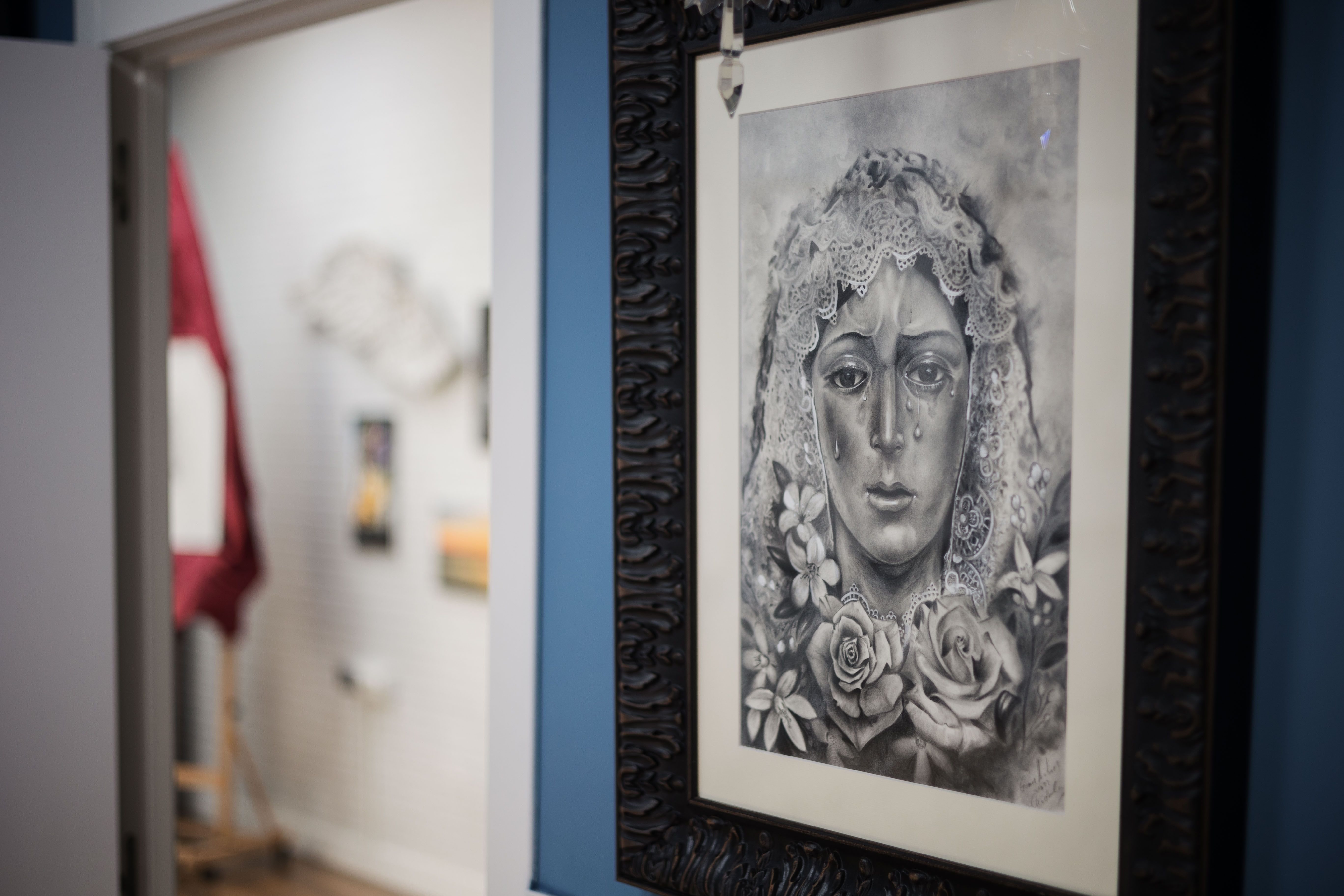 Una parte de su estudio es una galería. Allí se observan distintos dibujos y bocetos. Muchos de ellos pueden acabar en cualquier hombro, antebrazo o gemelo. Él aconseja sobre lo que le proponen, pero no impone. "Lo que sale en Sevilla esta semana son obras de arte. Es un museo que lo sacamos a la calle. Existe una magia súper artística", dice sobre la dificultad para ser sevillano y no ser cofrade.