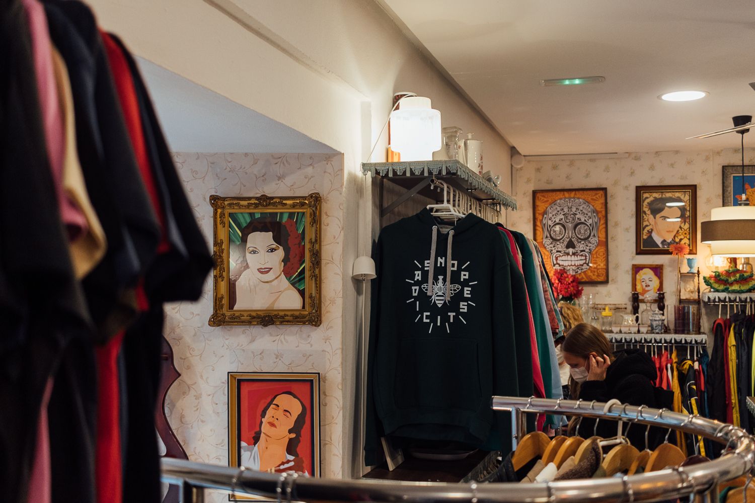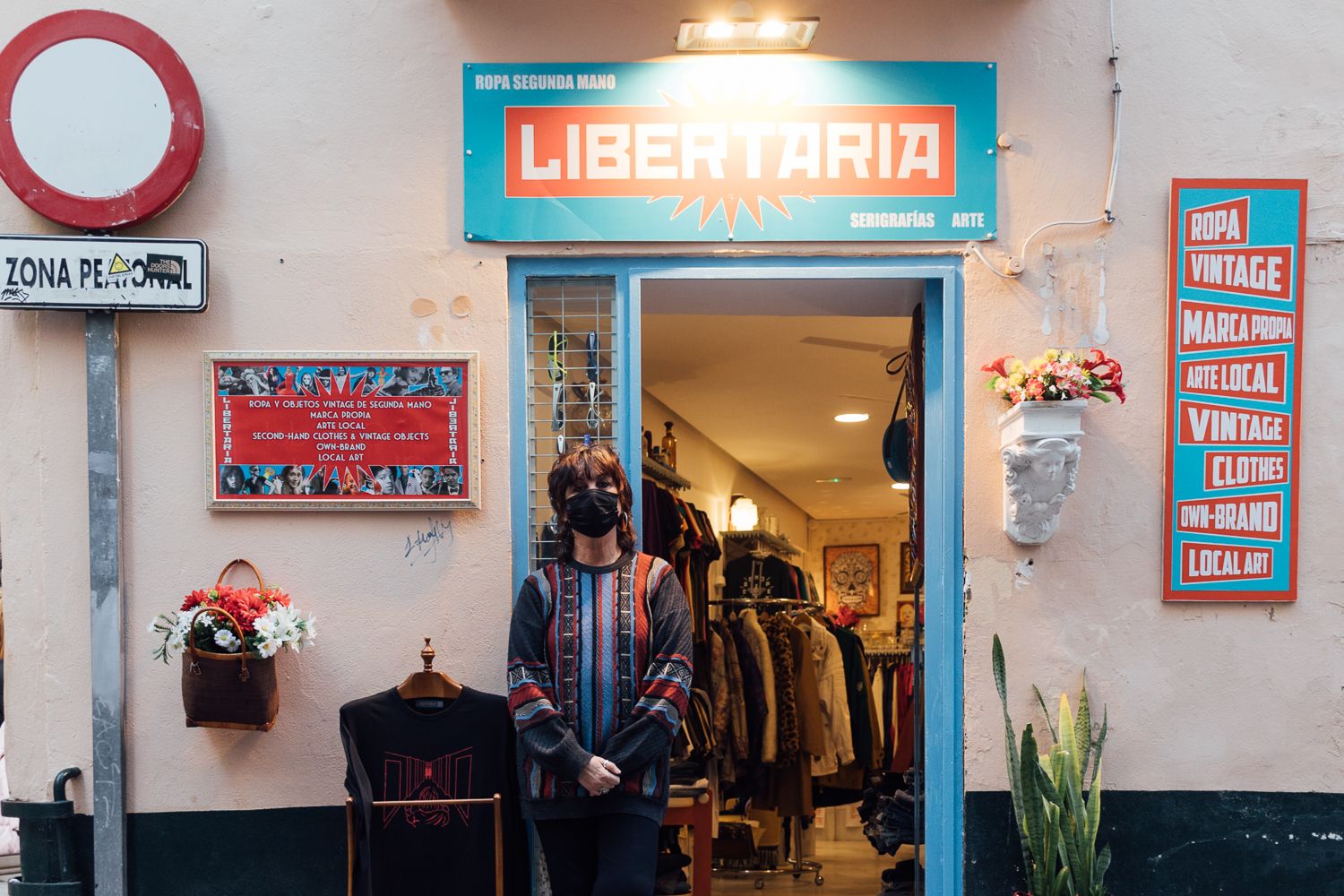 Libertaria tiene un escaparate de esos en los que quedarse embobados. Retratos digitales de Rocío Jurado, Gustavo Adolfo Bécquer o Camarón de la Isla reposan junto a tazas, teteras o figuras decorativas. Al fondo un sinfín de chaquetas, vaqueros o camisas con “un rollo antiguo y vintage” componen el negocio de Migita Dakota.