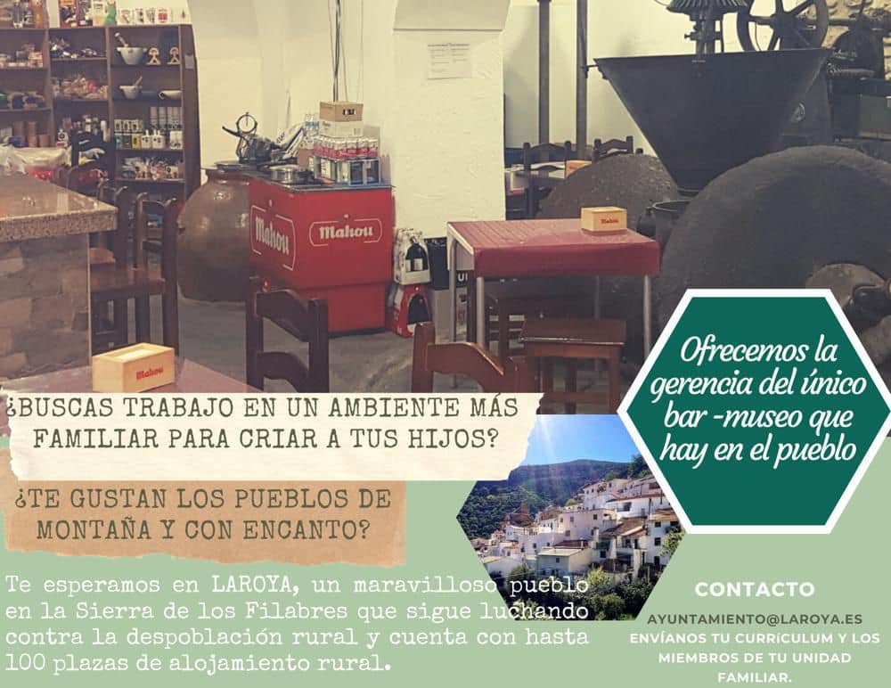 Un pueblo de Almería ubicado en la Sierra de los Filabres lucha contra la despoblación rural. El Ayuntamiento de Laroya ha decidido ofrecer gratis la gerencia del único bar mueso que existe en esta localidad de 200 habitantes con el fin de llenarla de vida. Así, ha publicado un anuncio para localizar, concretamente, a una pareja, que tenga niños de entre 3 y 10 años para que continúe con el negocio.
