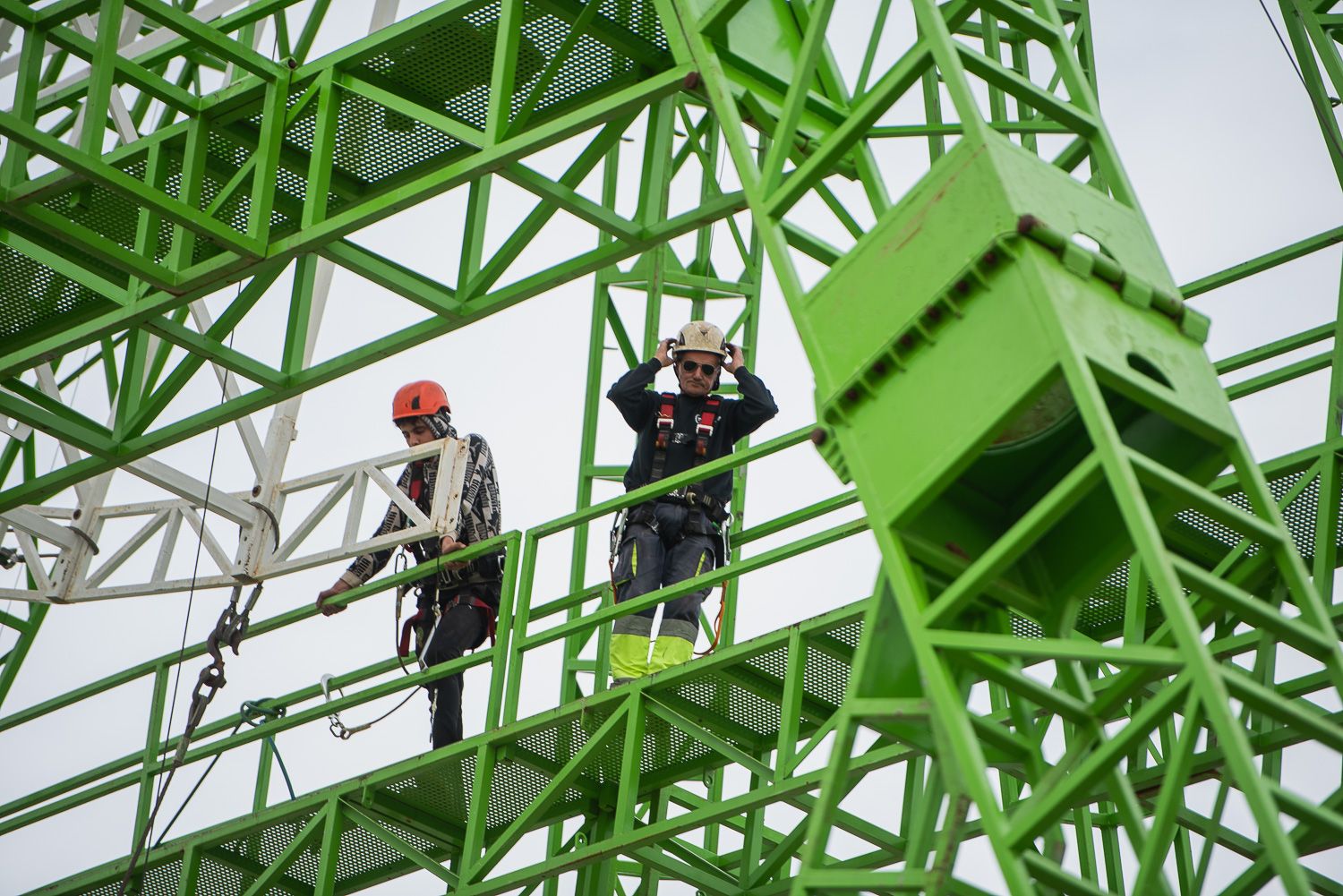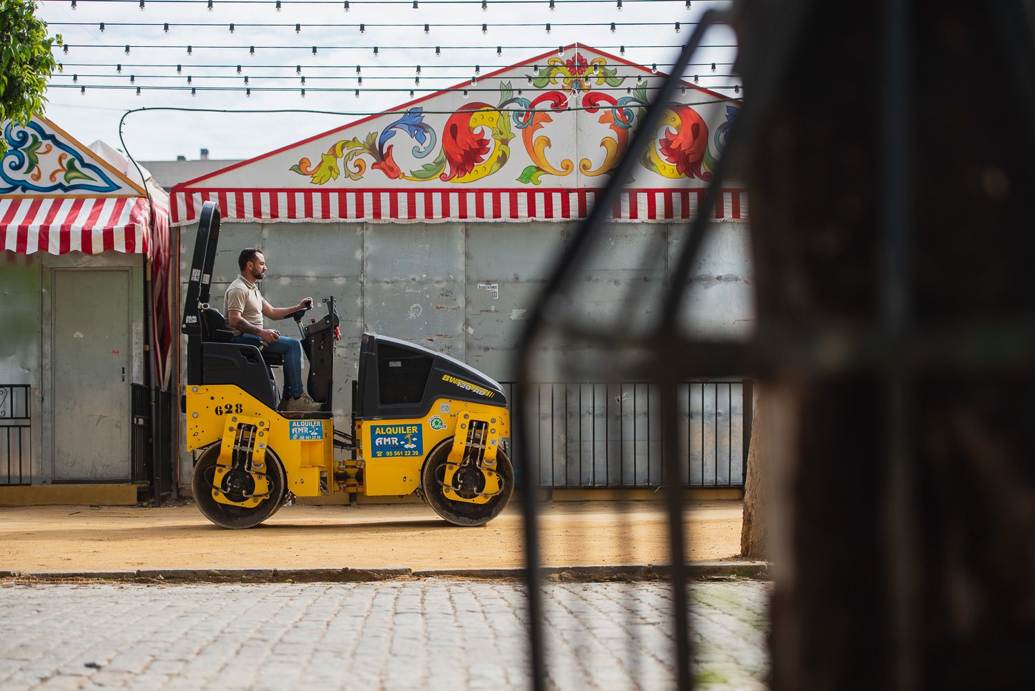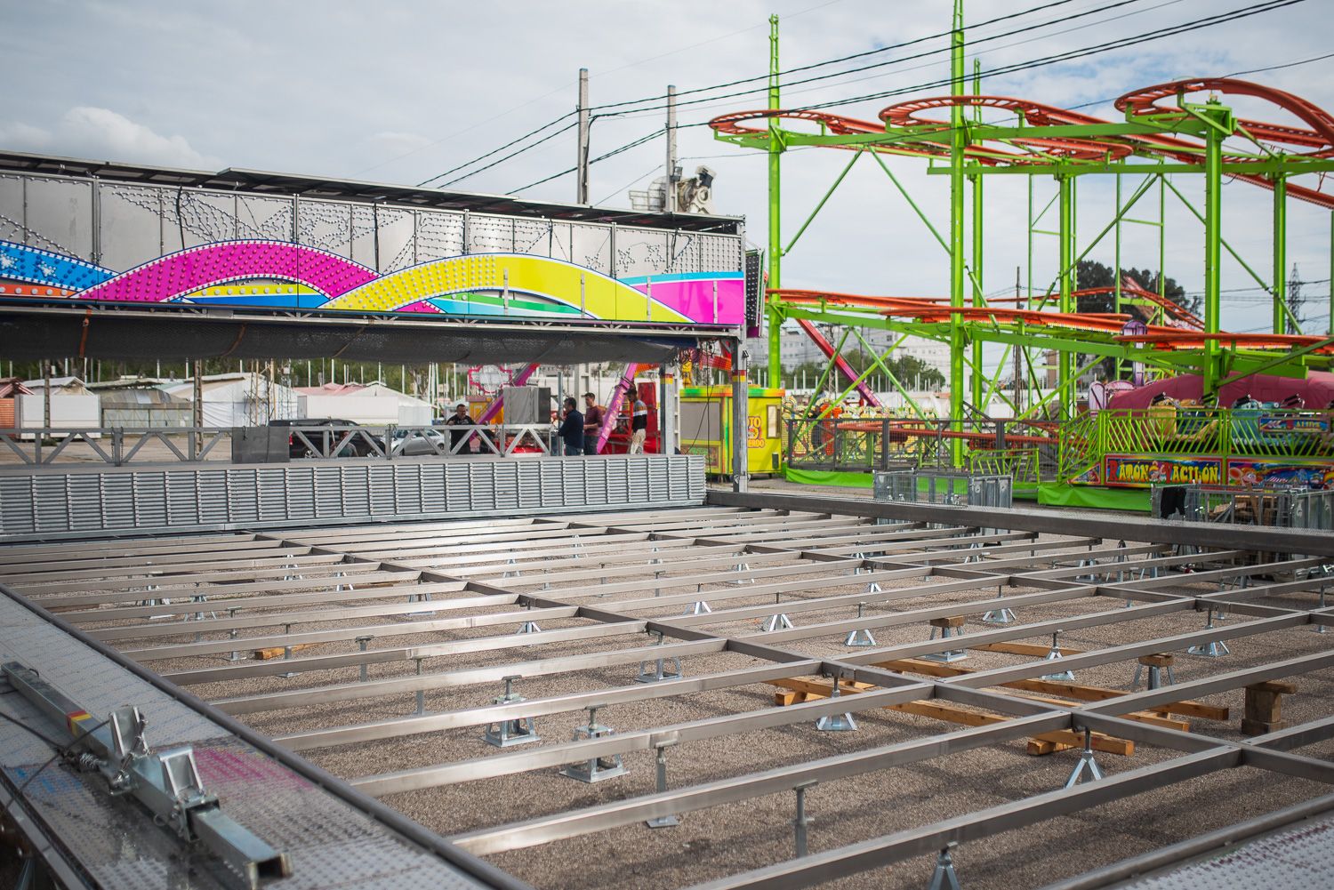 Un trabajador montando una atracción en la Calle del Infierno de Sevilla.