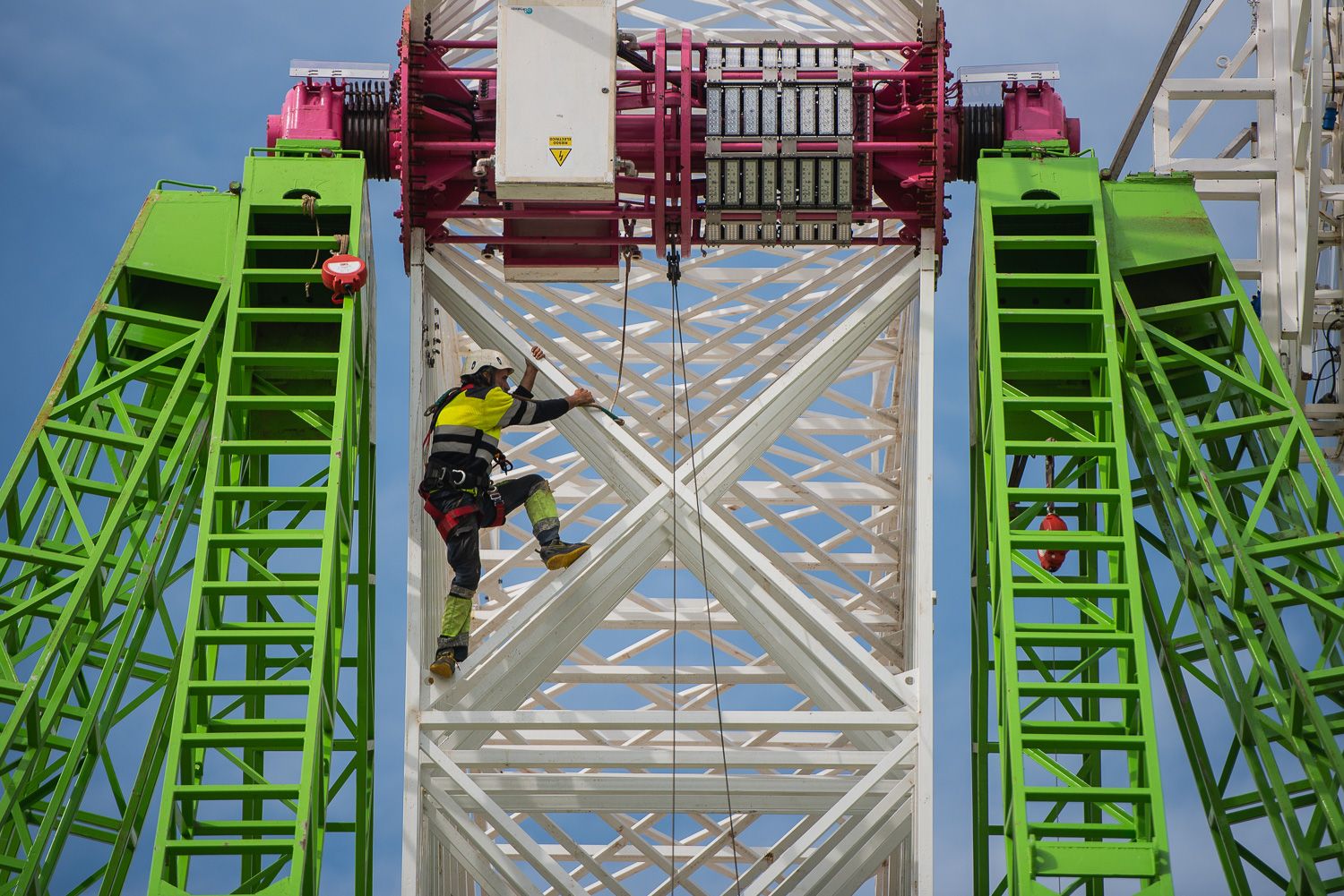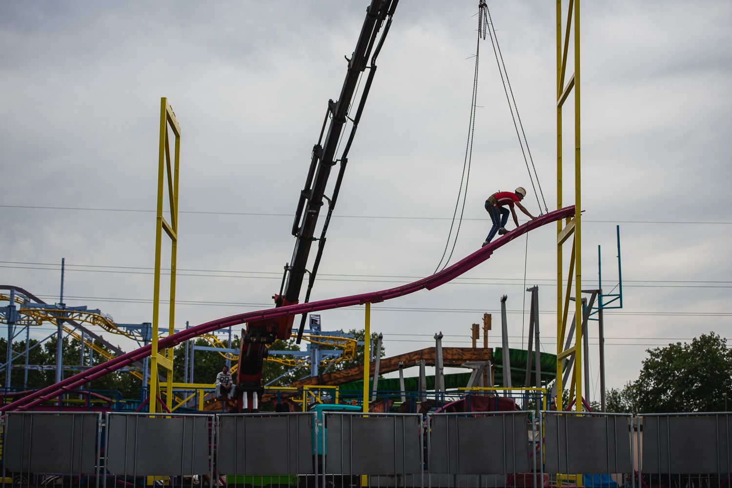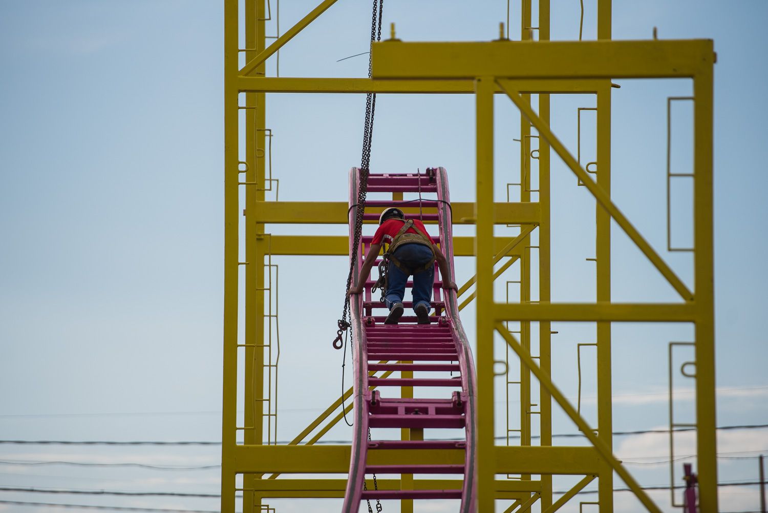 Un operario, montando una atracción en la Calle del Infierno de Sevilla.