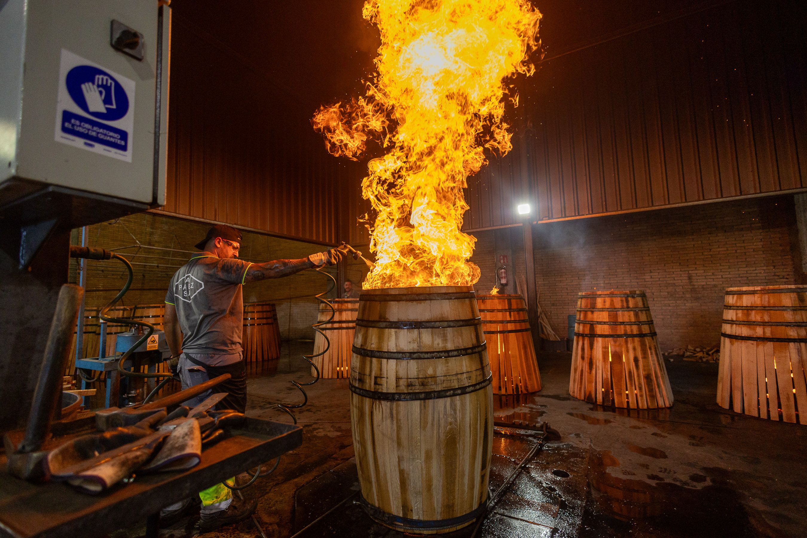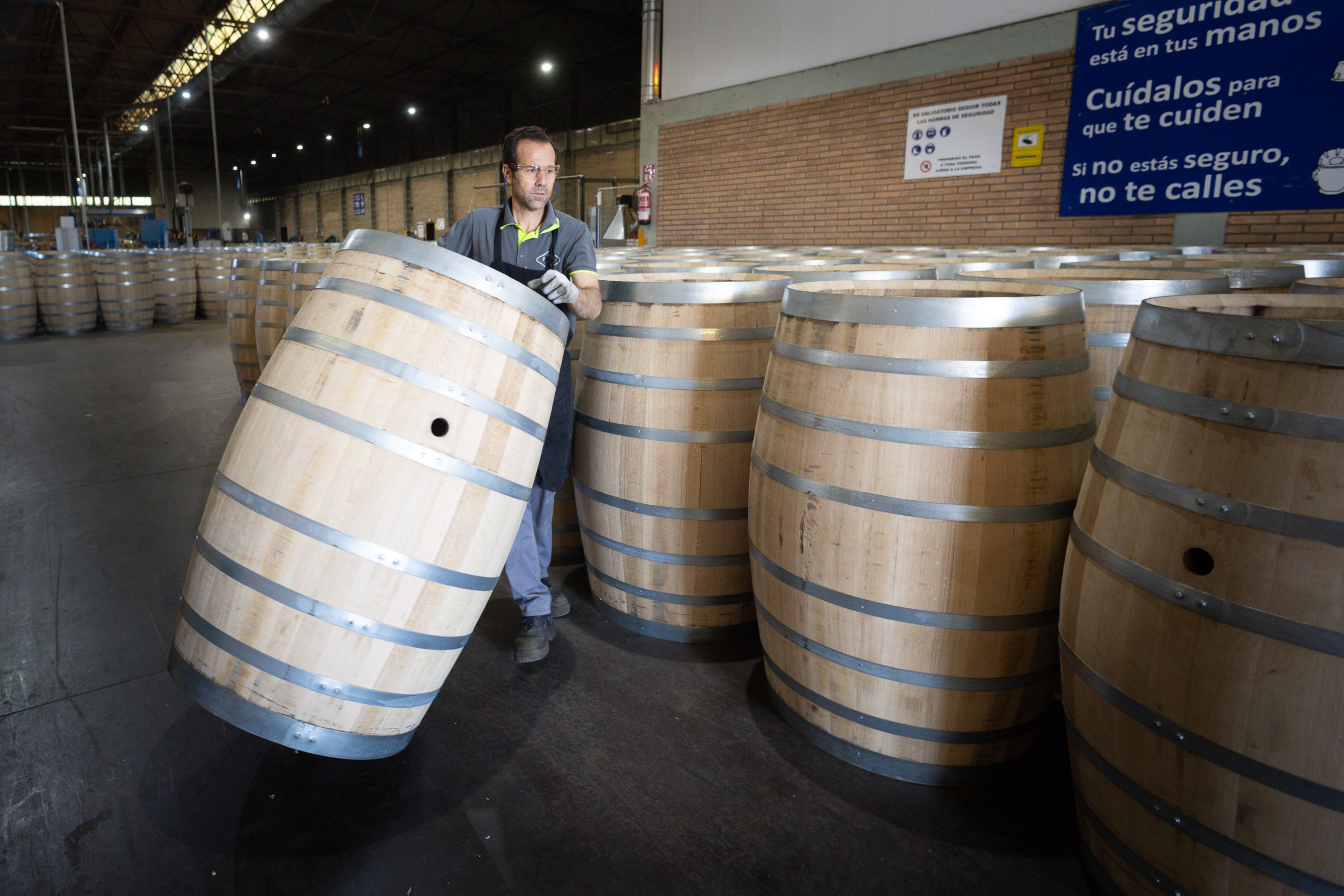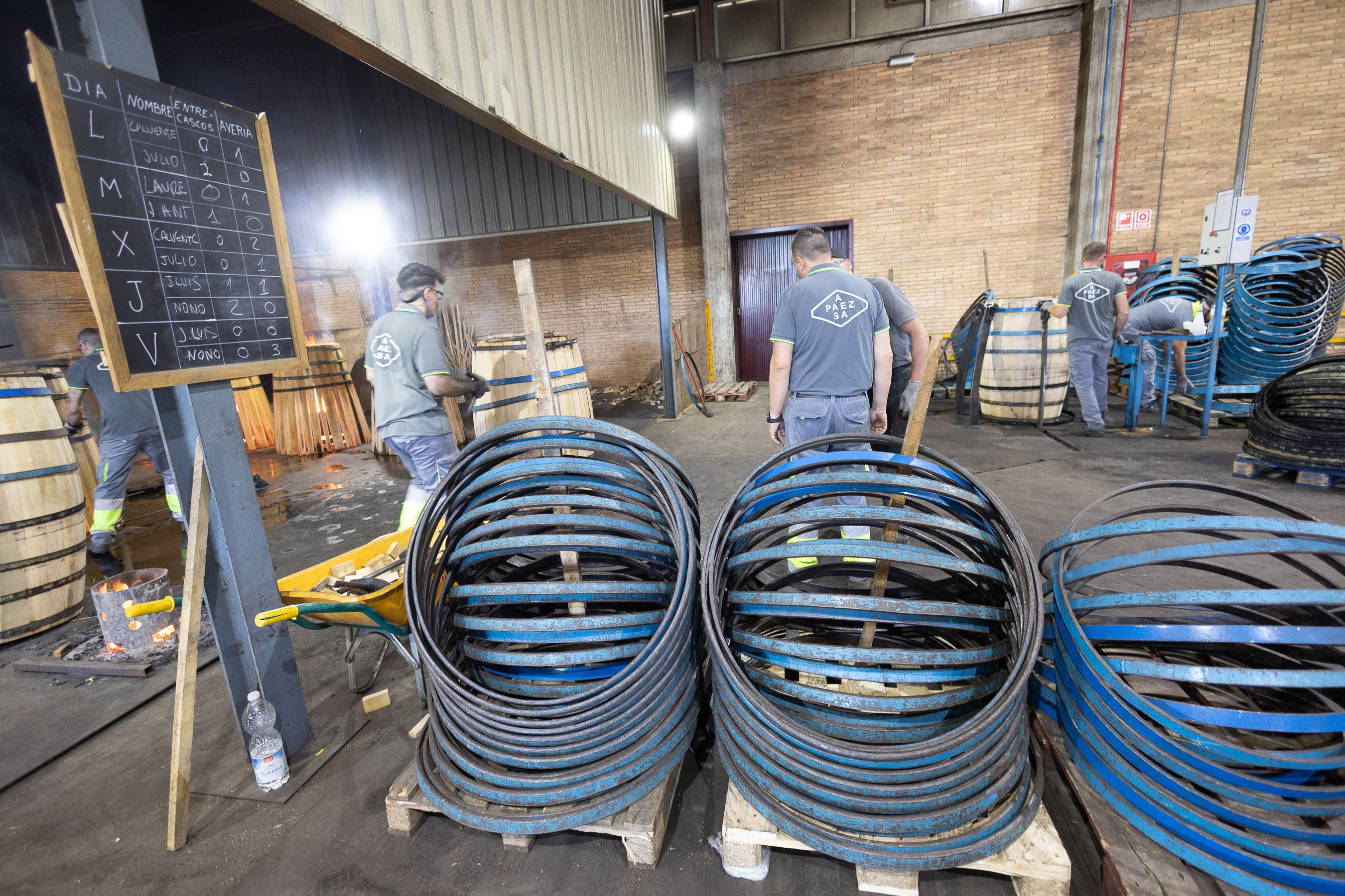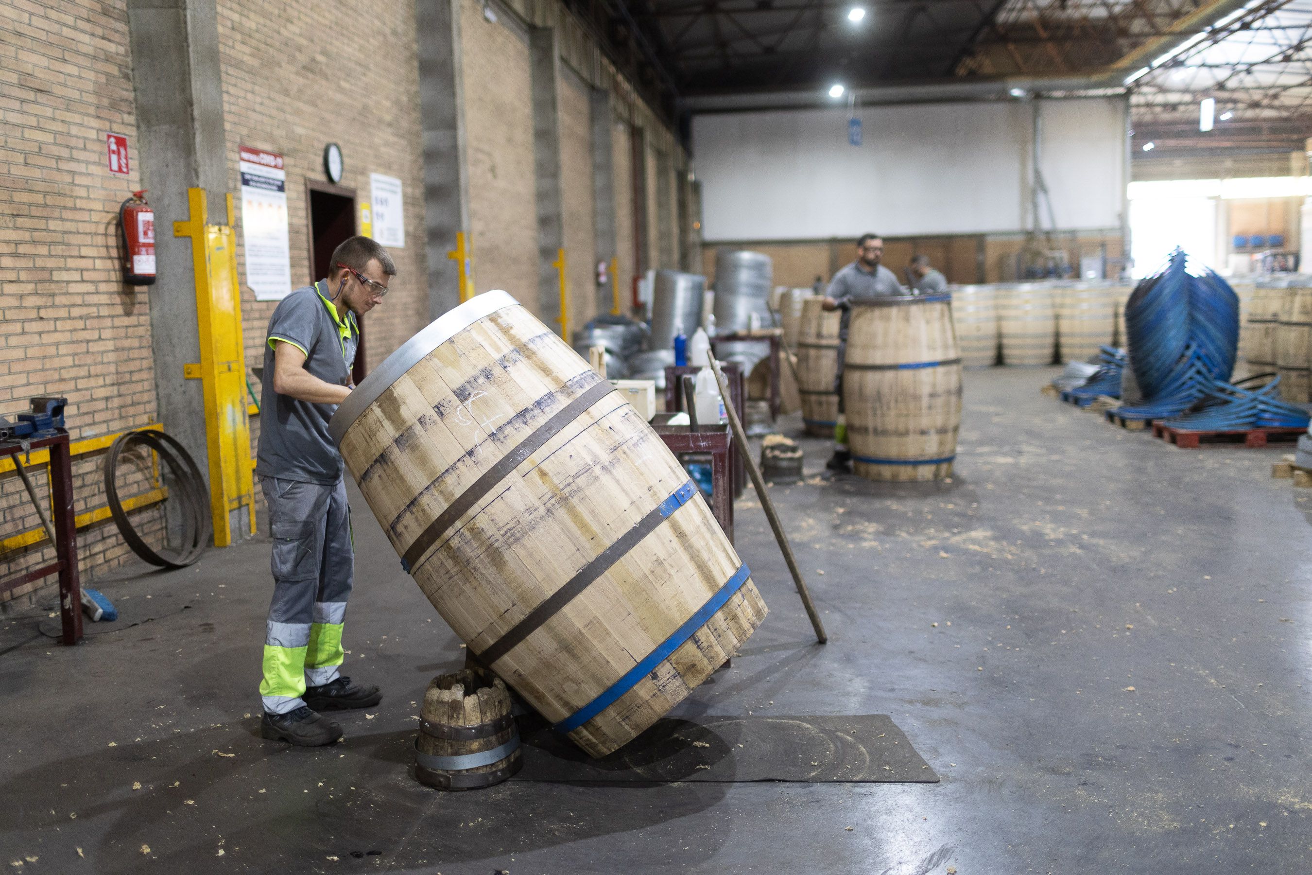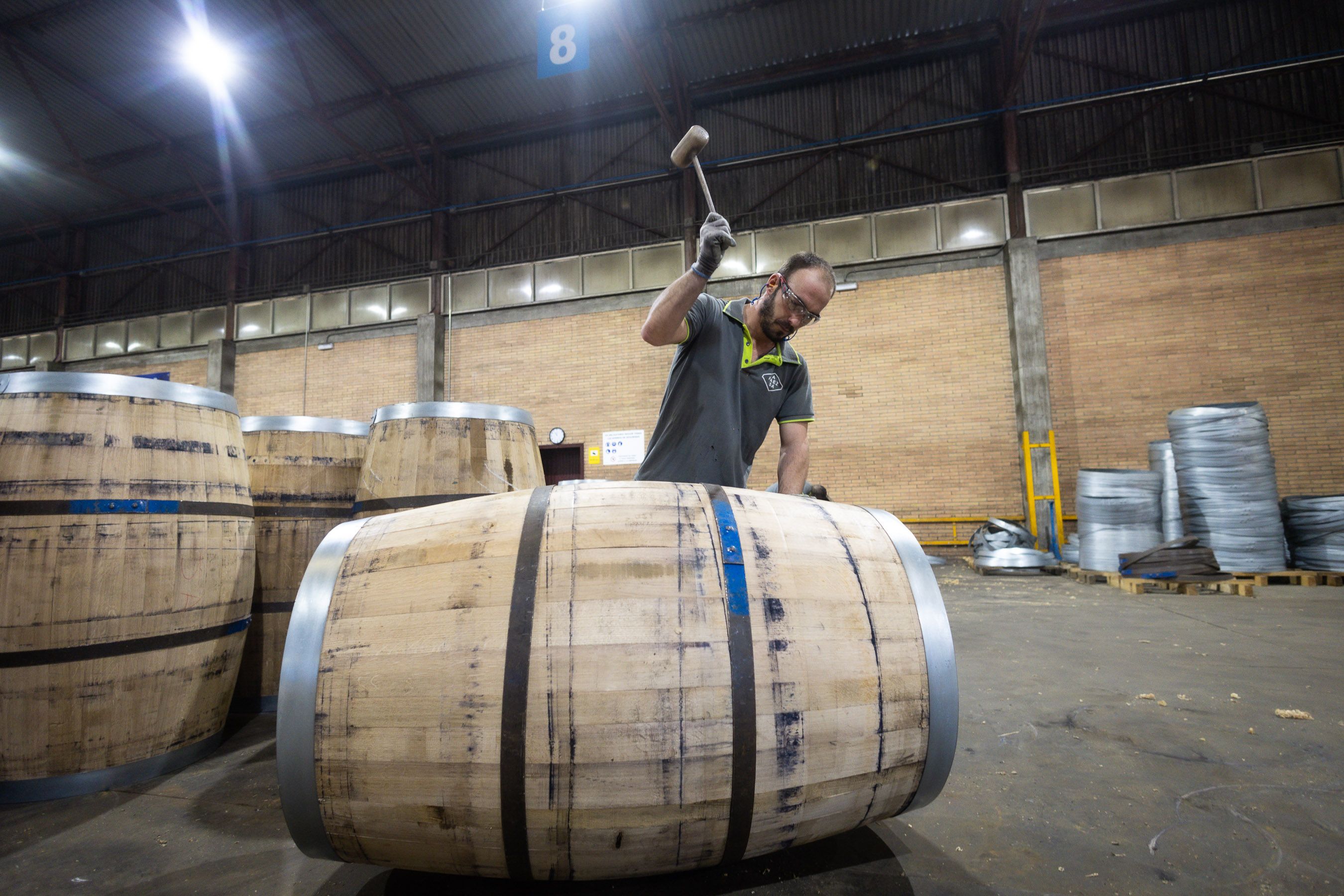 Un tonelero trabaja en el centro visitas de la Tonelería Paez Lobato