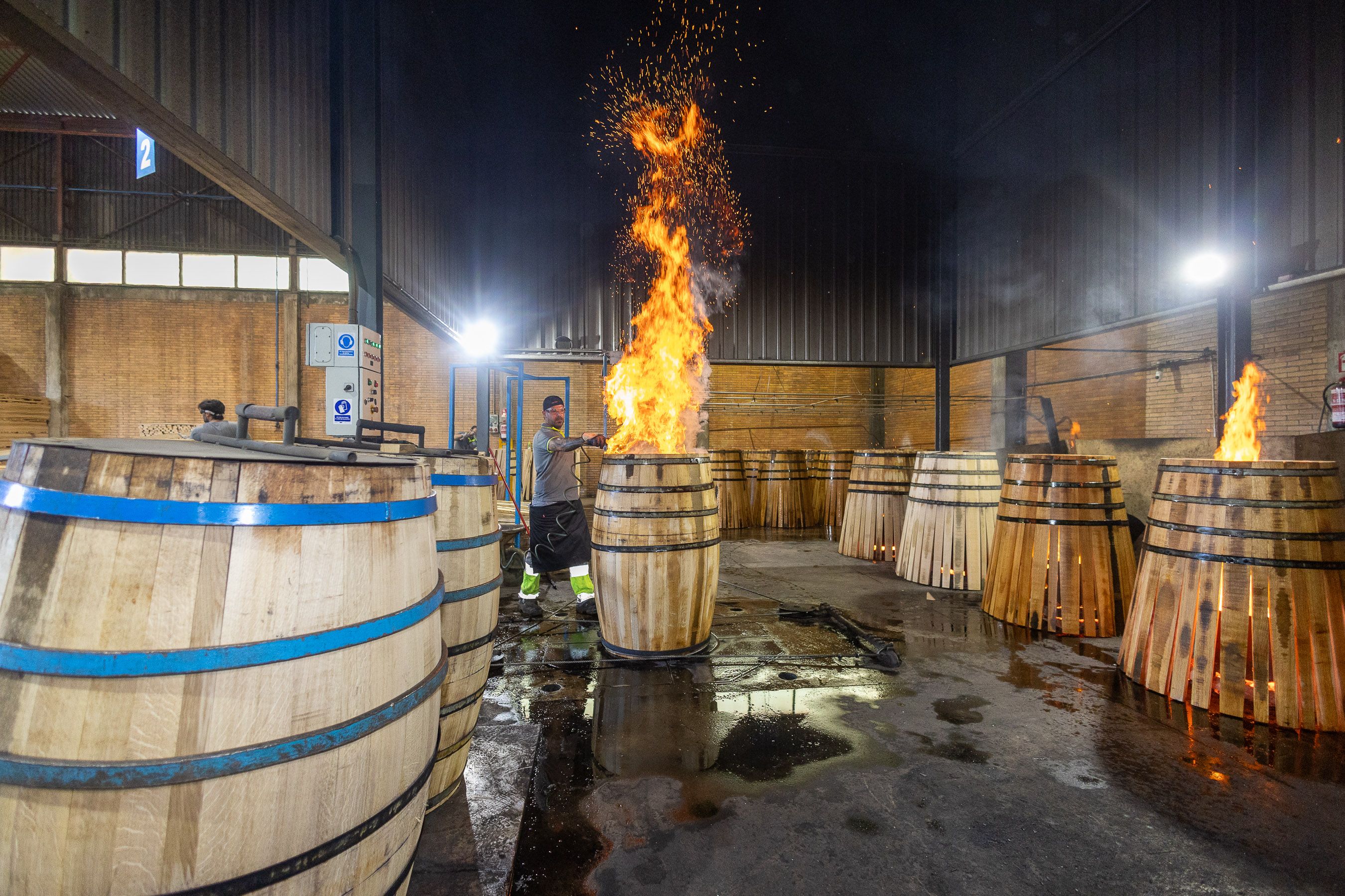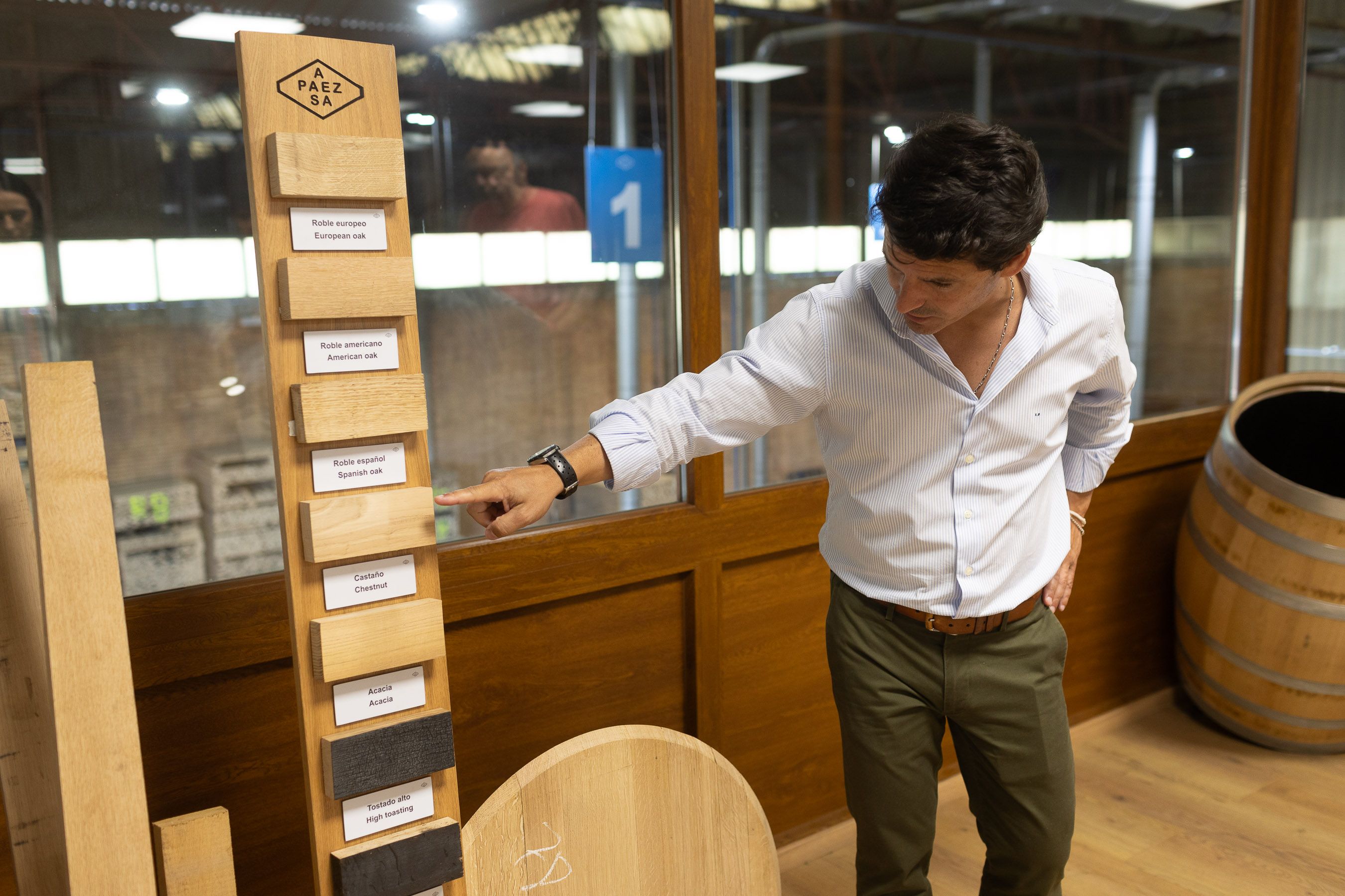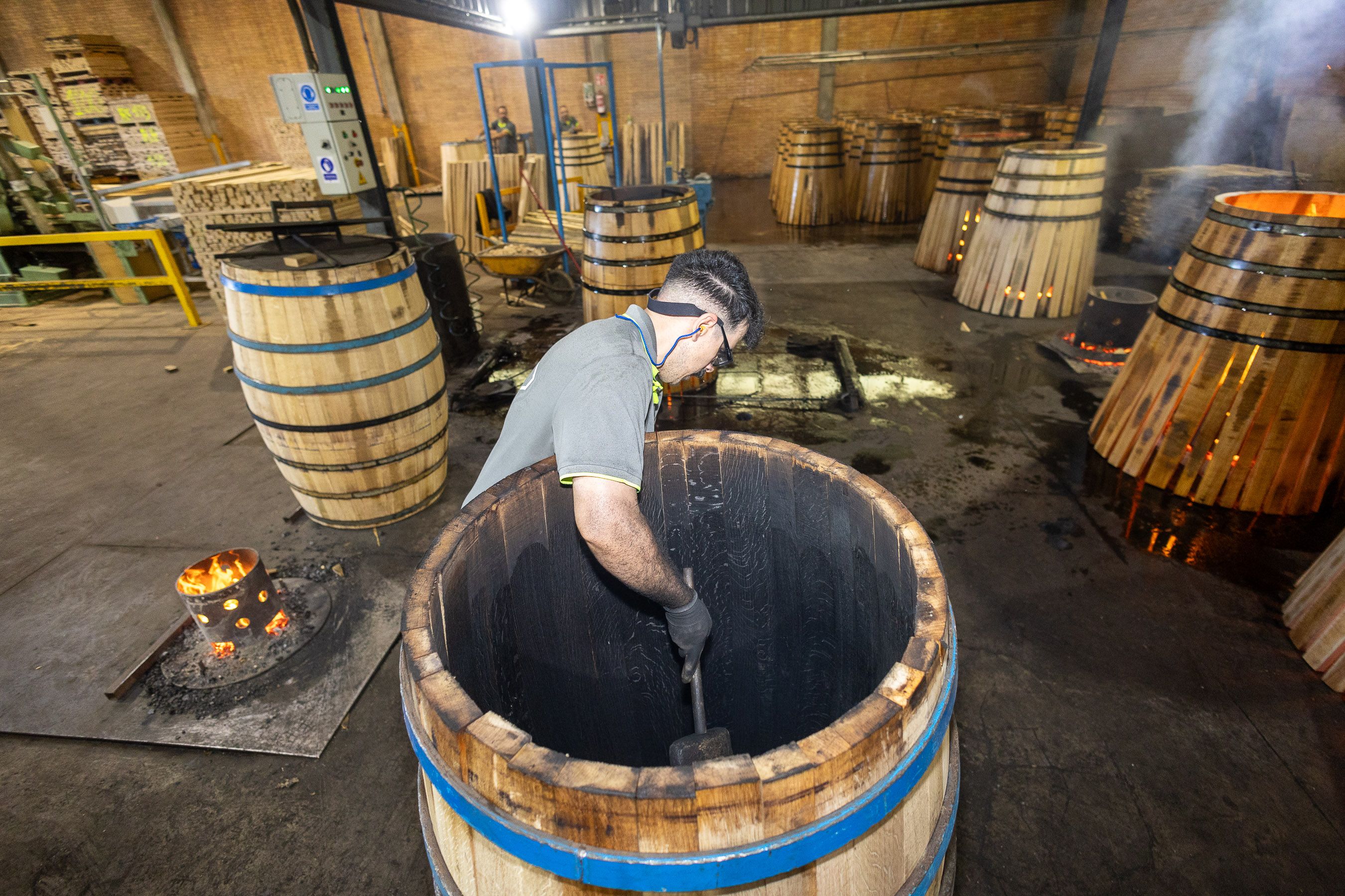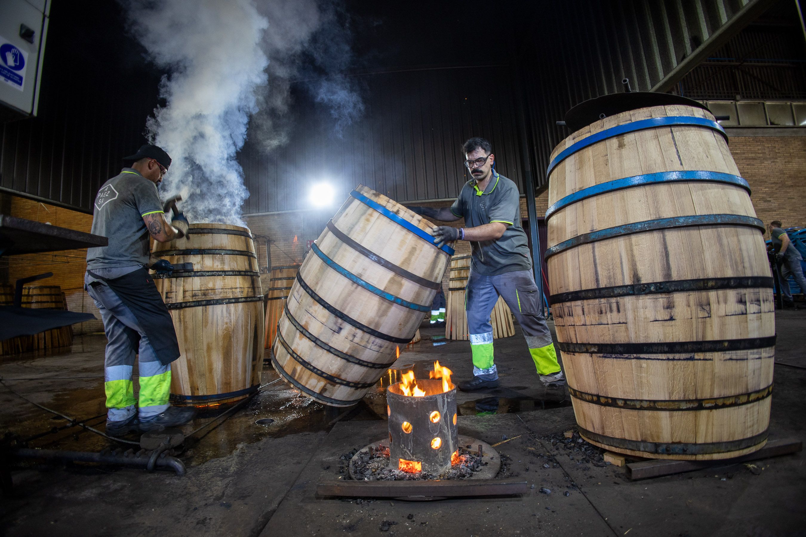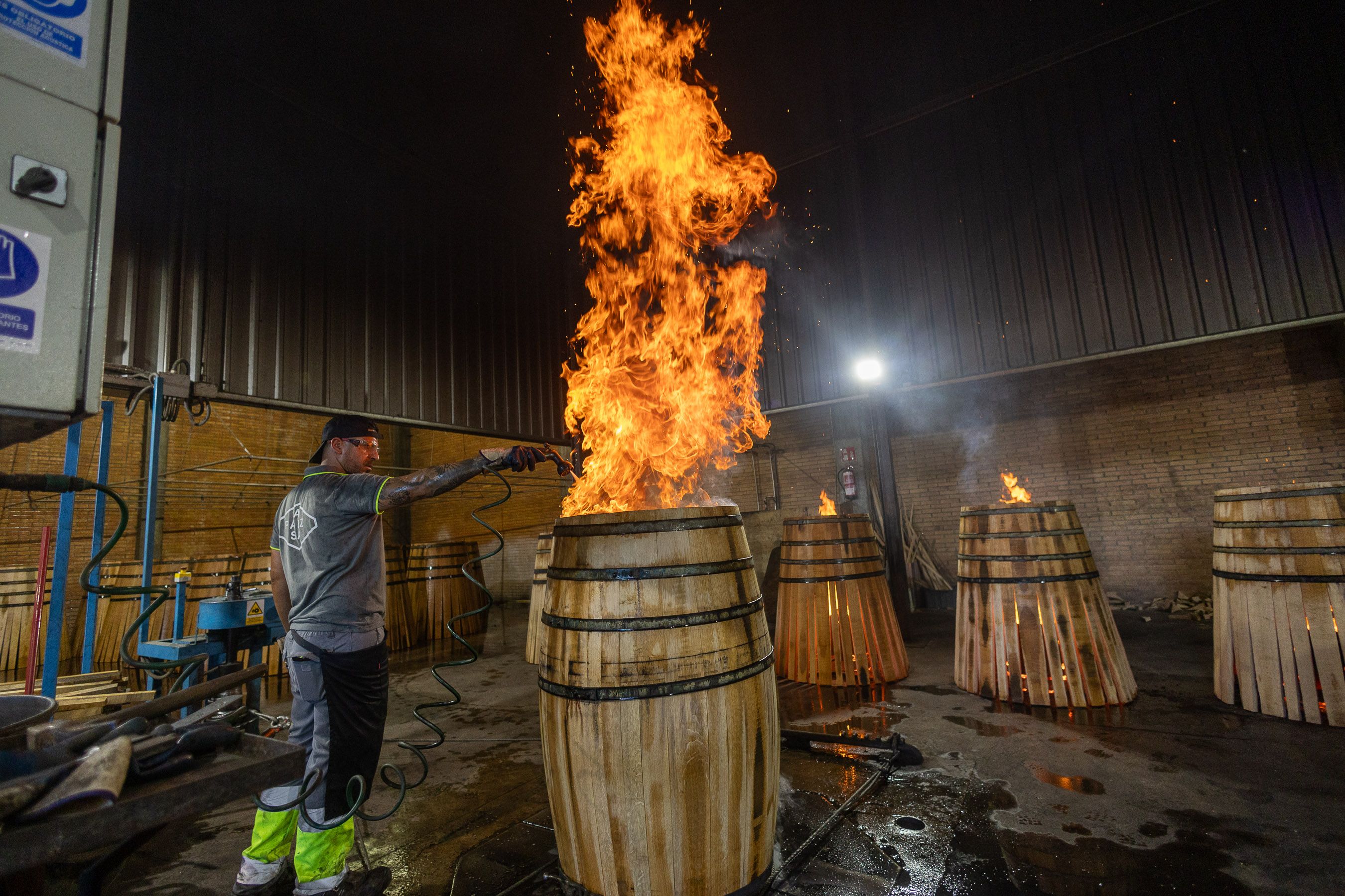 Un tonelero trabaja en el centro visitas de la Tonelería Paez Lobato