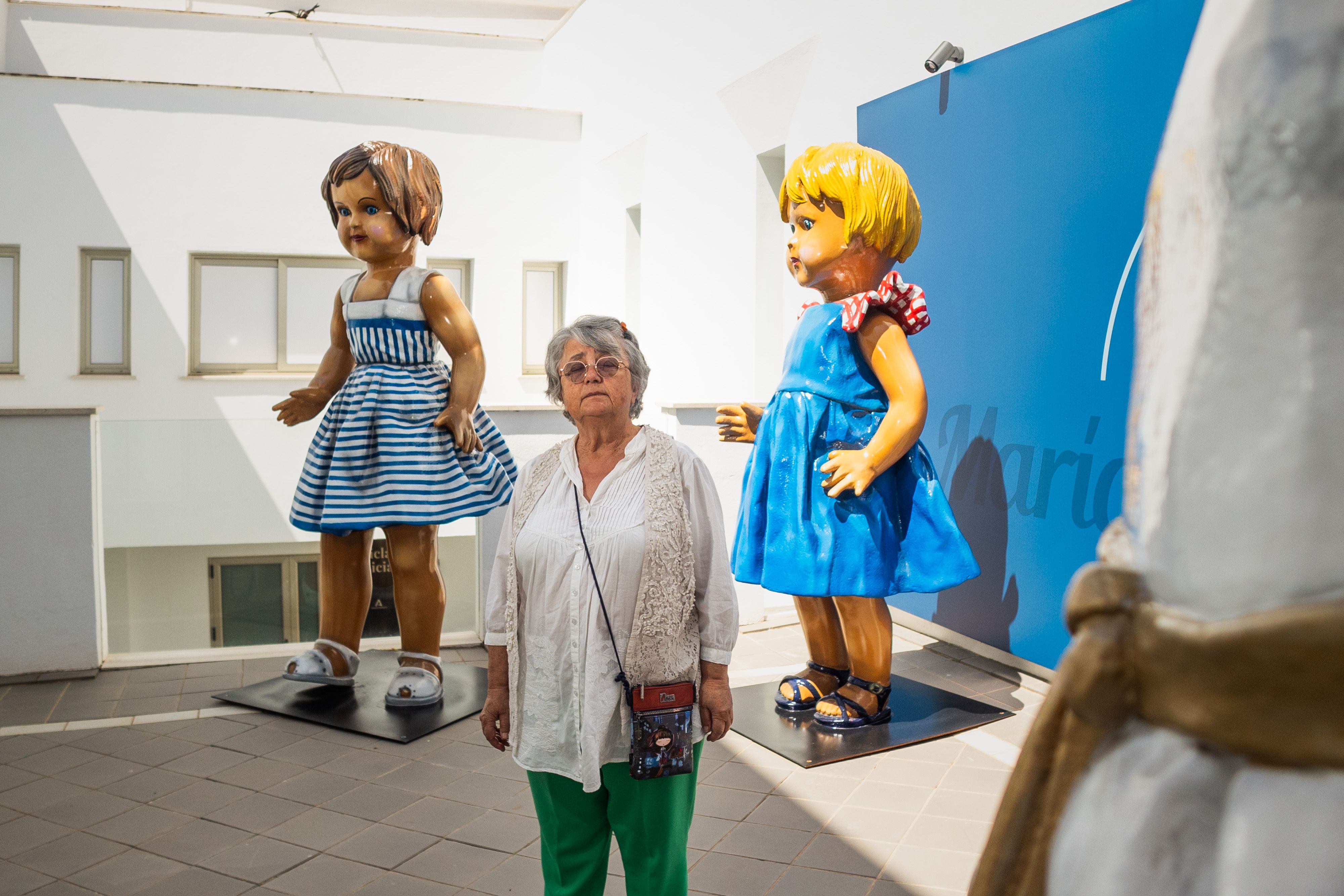 María Emilia, junto a dos muñecas de gran tamaño, en el museo de Chiclana.
