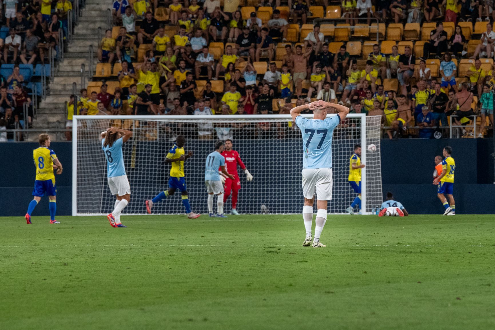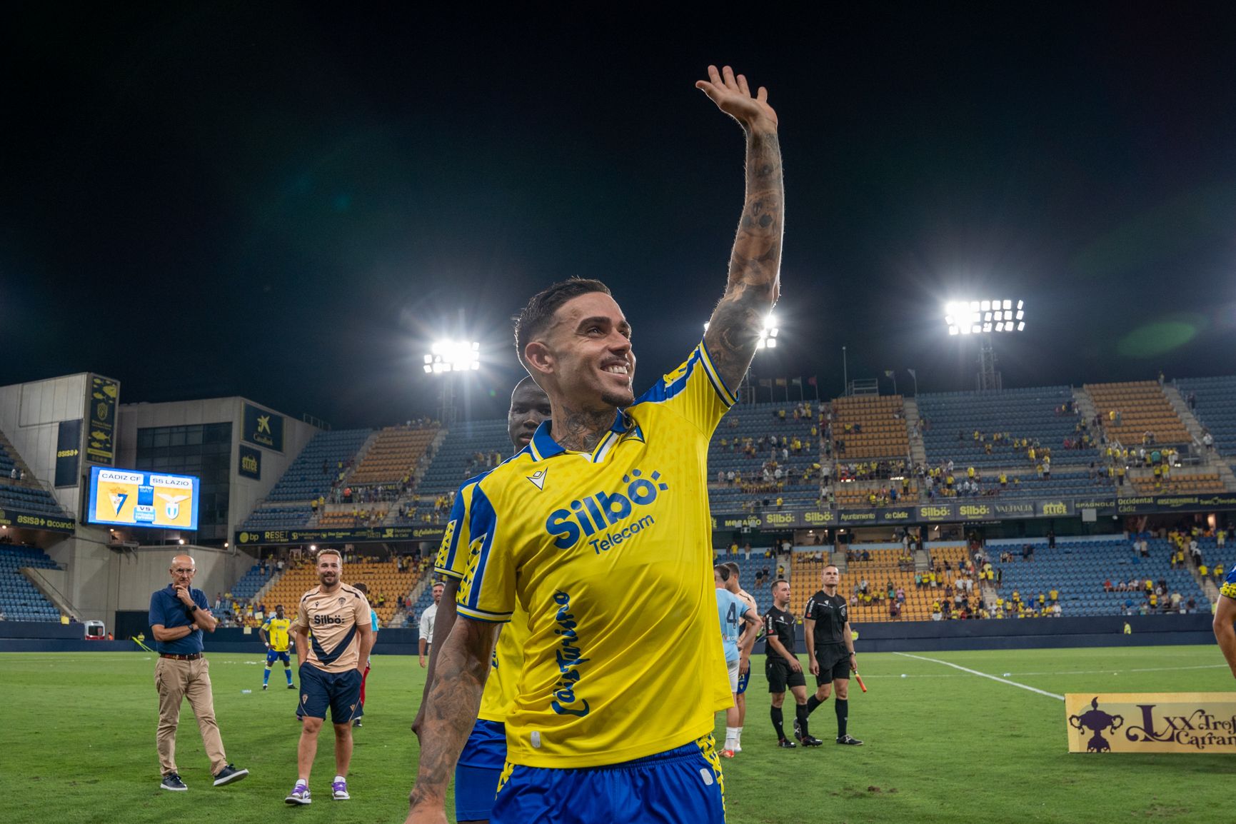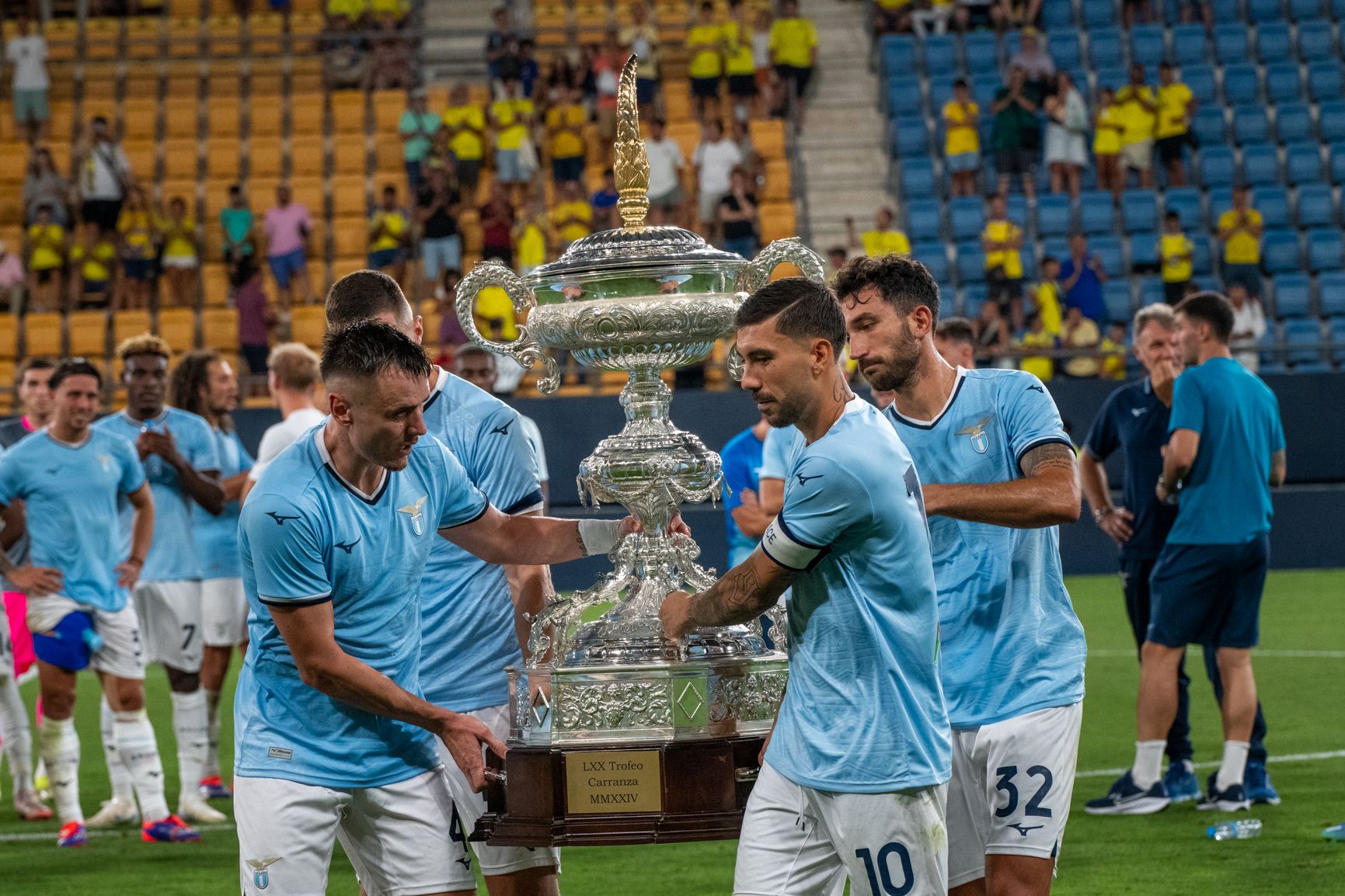 Traslado de la copa durante el Trofeo Carranza de 2024 con un estadio ya vacío.