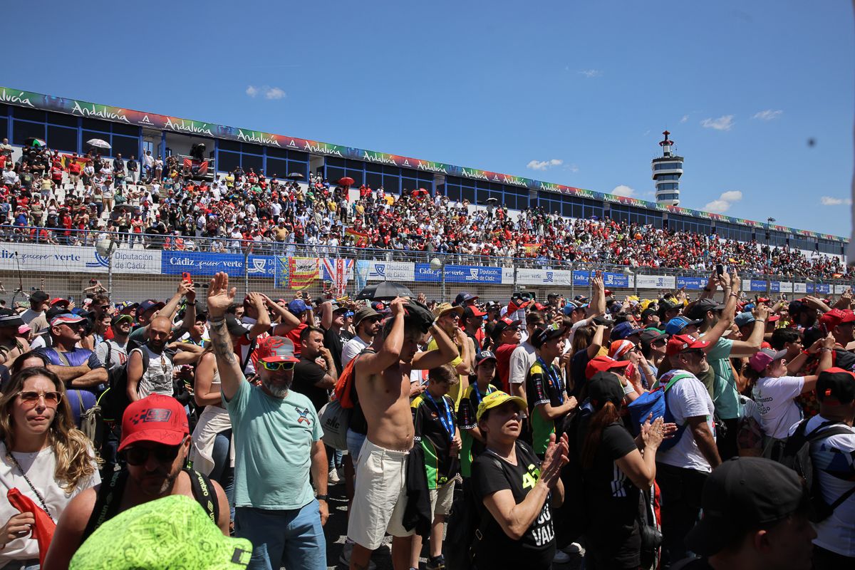 El público de Jerez durante la entrega de premios en un podio que ya es historia del motociclismo