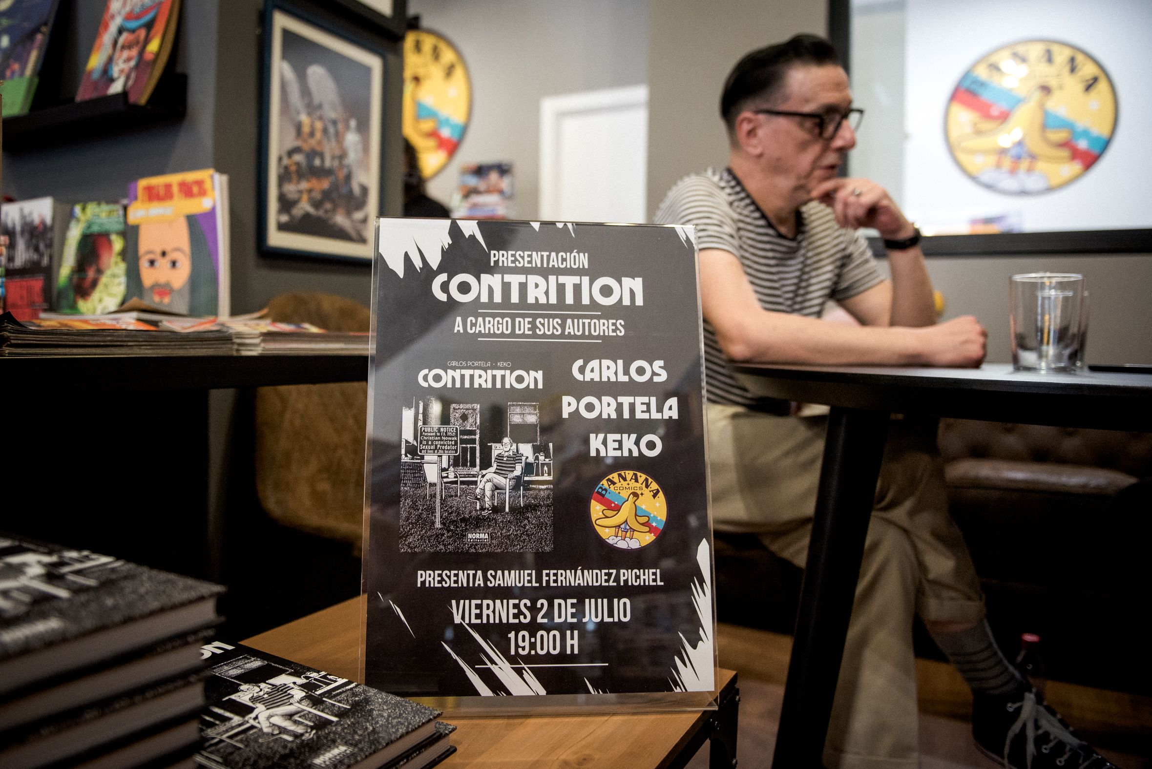 Hacer algo en equipo requiere de ciertas capacidades. Cuando uno aporta el texto y otro la ilustración existe el riesgo de que no encajen. Eso no ha ocurrido en Contrition, el nuevo cómic de Carlos Portela (guion) y Keko (ilustración). Ambos coinciden en que trabajar juntos les ha permitido tener una visión y dar matices a la obra que no estaban en la idea original. Con esta nueva historieta reivindican el cómic como un medio de expresión al mismo nivel que cualquier otro abordando cuestiones trascendentales. Acaba con cualquier tópico que haya sobre la historieta, si es que aún existe alguno. En su presentación en Sevilla, realizada en Banana Cómics, atienden a lavozdelsur.es para hablar de la obra, de sus trayectorias y del momento que vive actualmente el sector en España.