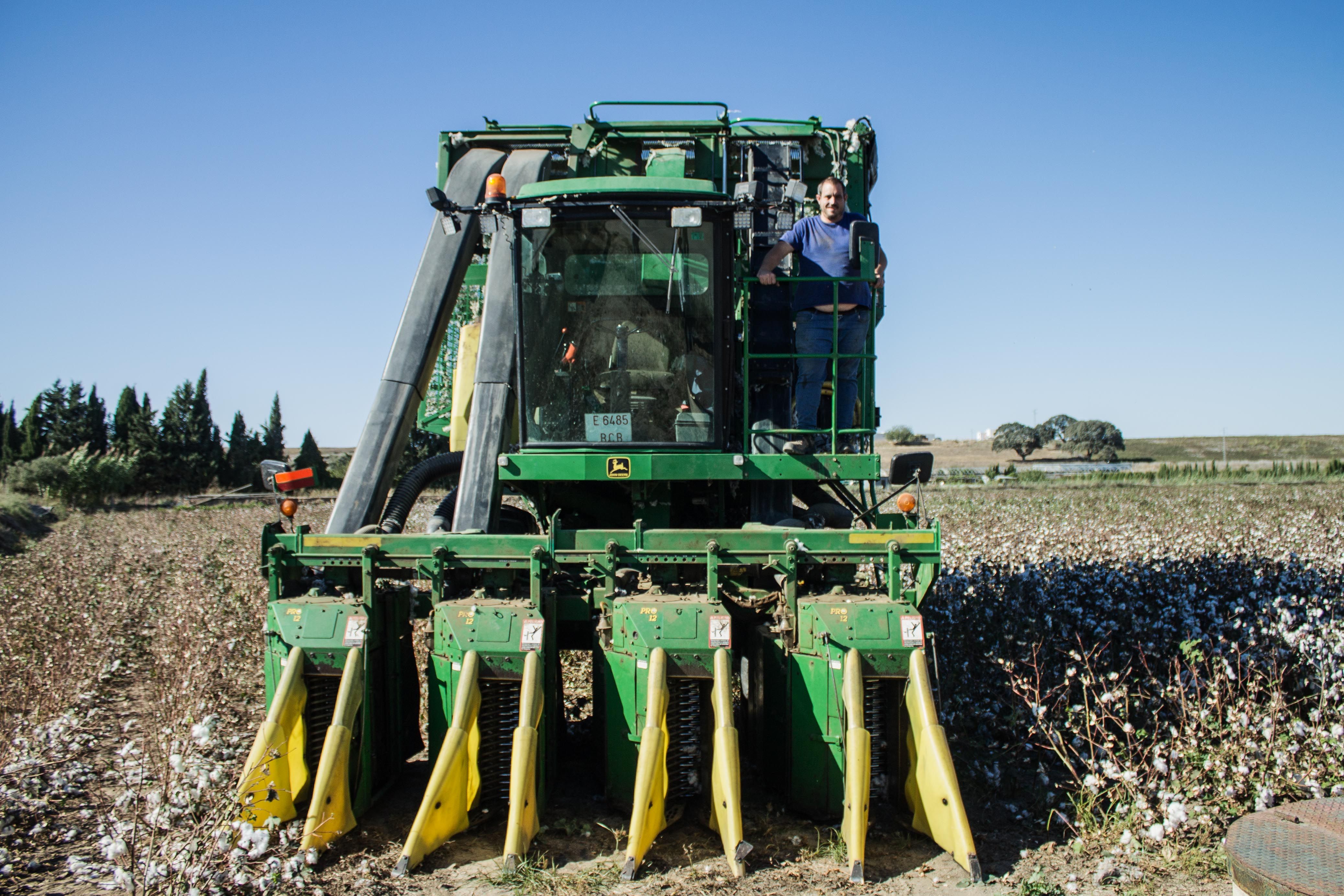 Por la carretera, señala desde su vehículo las parcelas en las que este año ha sembrado algodón. Acaba de empezar la campaña de recogida y ya se empiezan a ver las primeras cosechadoras en los terrenos, sobre todo en los pueblos de colonización jerezanos, donde se formaron cooperativas desde su creación hace unos 50 años. “Los agricultores lo hicieron para minimizar los costes y tienen la historia que tenga el pueblo”, dice el también responsable del cultivo de algodón de la Coordinadora de Organizaciones de Agricultores y Ganaderos (COAG) en Andalucía.