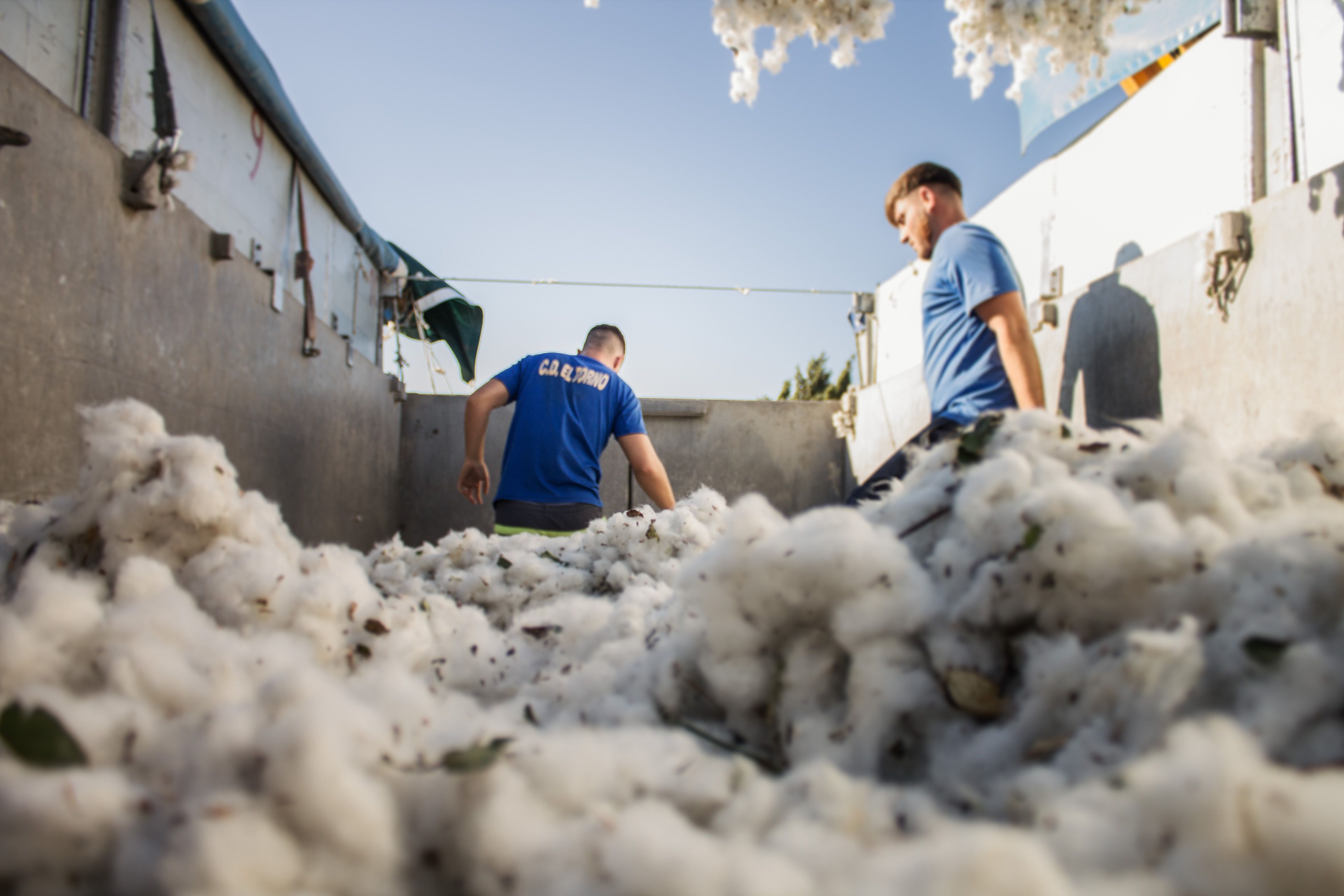 Mientras tanto, una cuadrilla de pisadores ya están preparados para compactar el algodón en un camión con el fin de que se pueda rellenar el máximo posible. Los jóvenes, con agilidad, se mueven en el interior del vehículo esquivando los restos de ramas que golpean sus ojos debido al fuerte viento.