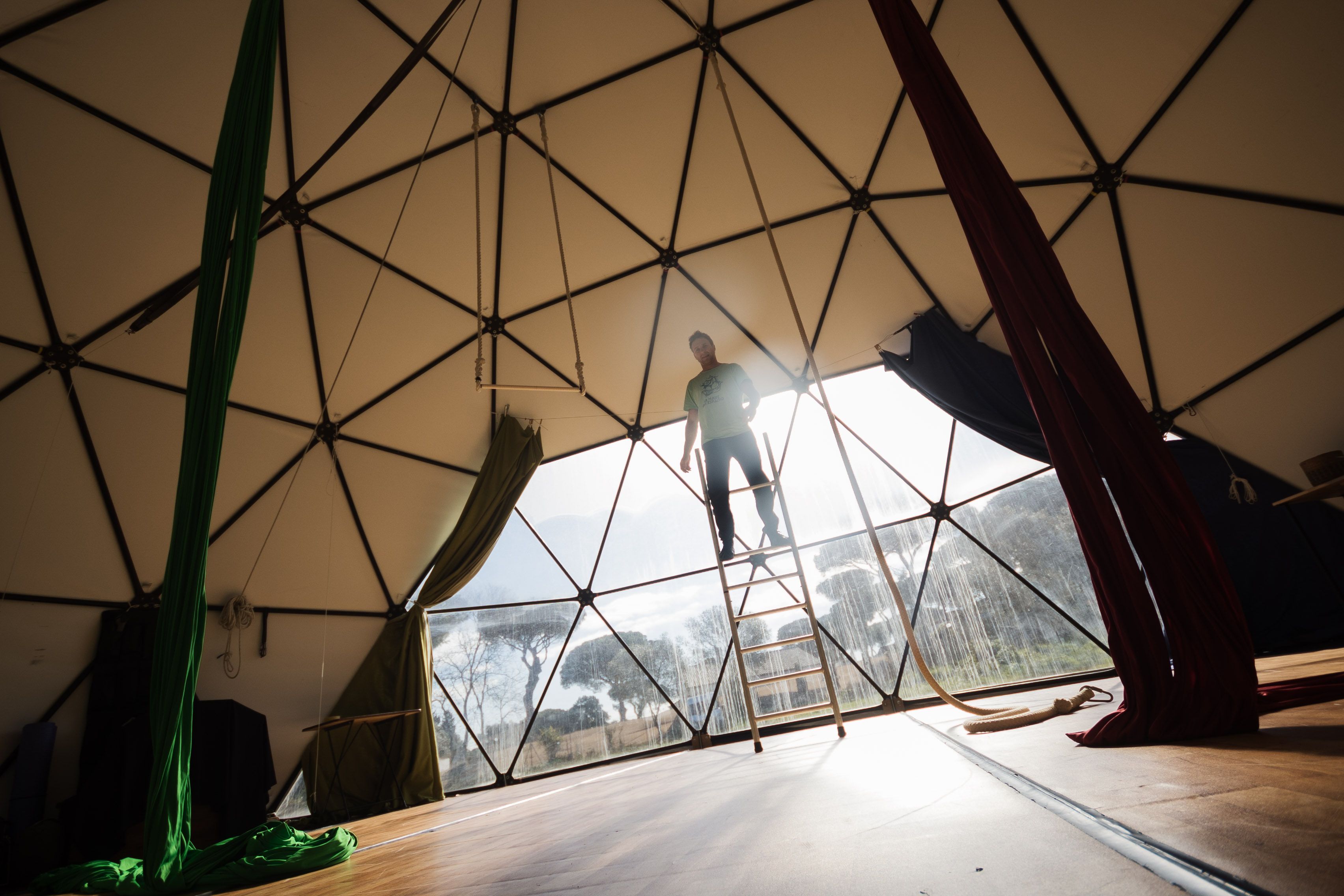 Así, cuentan con un gran domo circular cuya cubierta trata de imitar la apariencia de un casco de astronauta. En su interior se encuentran todos los utensilios, cuerdas, bancos, mazas, aros, etcétera, que necesitan para realizar sus espectáculos.