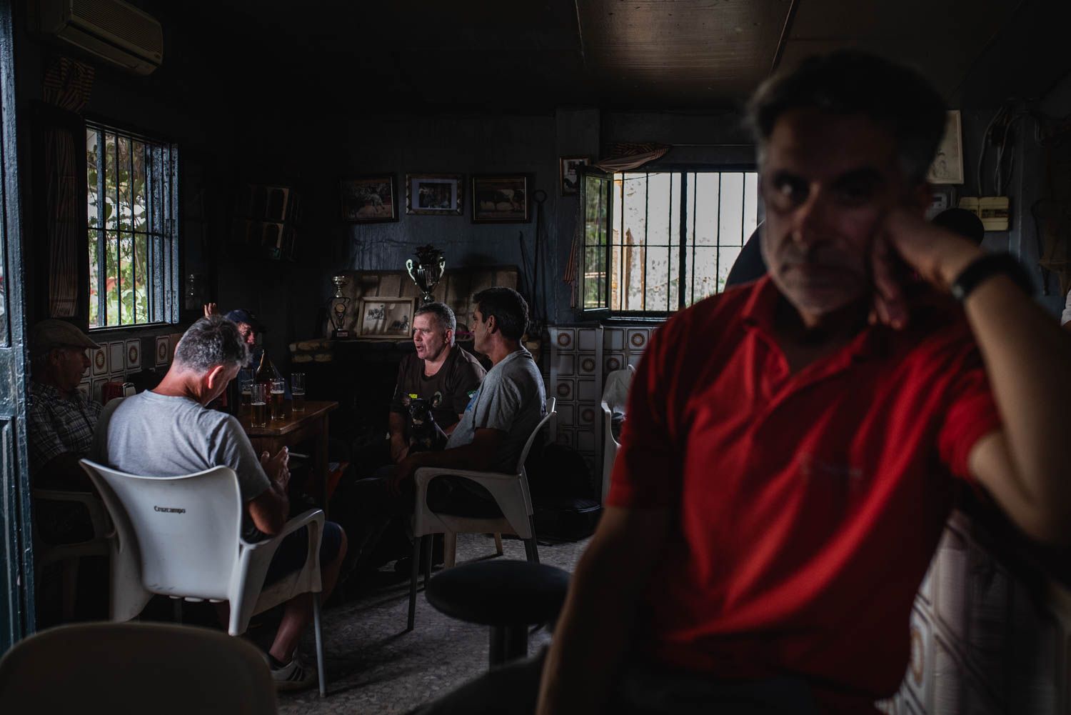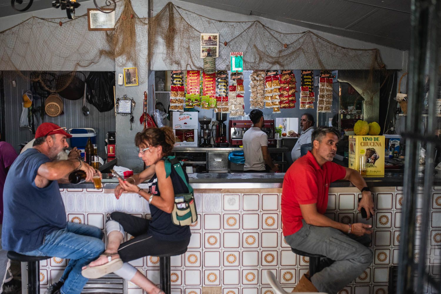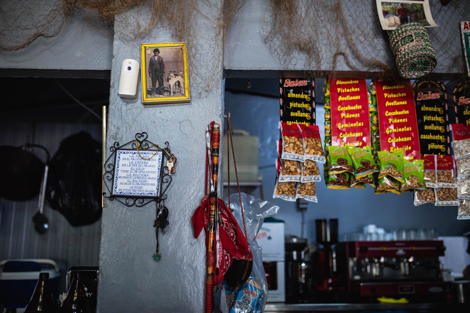 Un escudo del Real Betis en la pared, paquetes de patatas en la estantería, un calendario clavado donde se tachan los días y una imagen de la Virgen del Rocío. Podría ser un bar cualquiera de la provincia de Sevilla, pero no lo es. Sus particularidades no se observan a simple vista, pero apenas unos minutos sentado en la barra es suficiente para saber que se está pisando un lugar extraordinario donde decenas de historias se esconden en sus rincones. Un lugar donde poner el oído y escuchar te hace más sabio. Lo que viene siendo un bar de toda la vida que sigue viviendo en el mundo analógico mientras avanza lo digital.