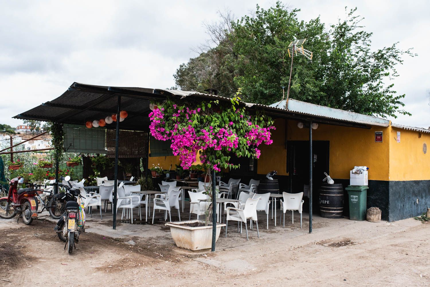 Encontrar palabras para definir el lugar no es sencillo. A un lado está el río. Entre él y el bar se interpone un pequeño huerto que ha montado este sevillano con tomates, calabacines, pimientos o berenjenas. "Échale fotos a lo sembrado. Esto es bueno", bromea. También tiene gallinas, perros y cochinillos si no he entendido mal. "Una zorra se comió a la mitad", lamenta.