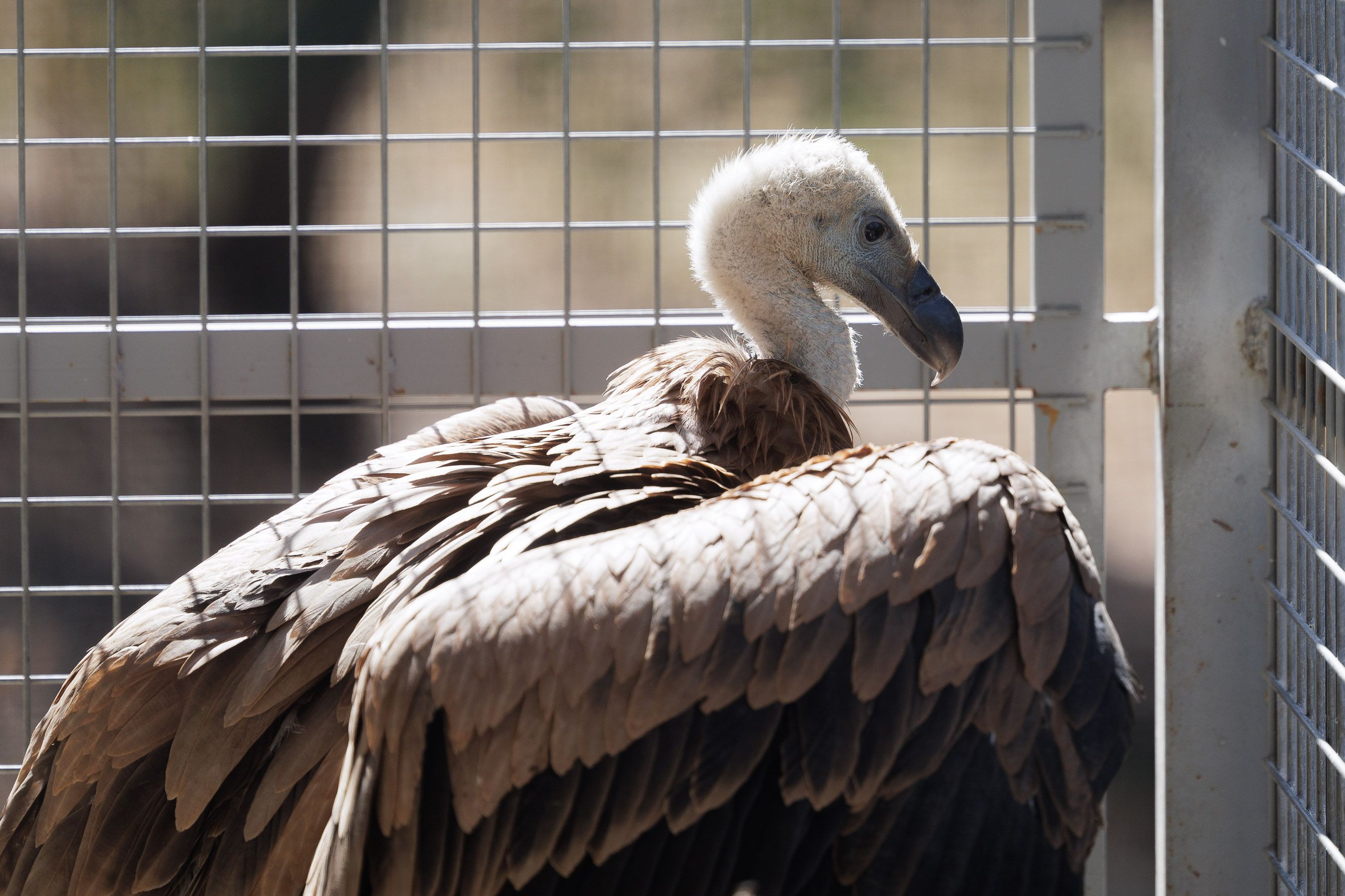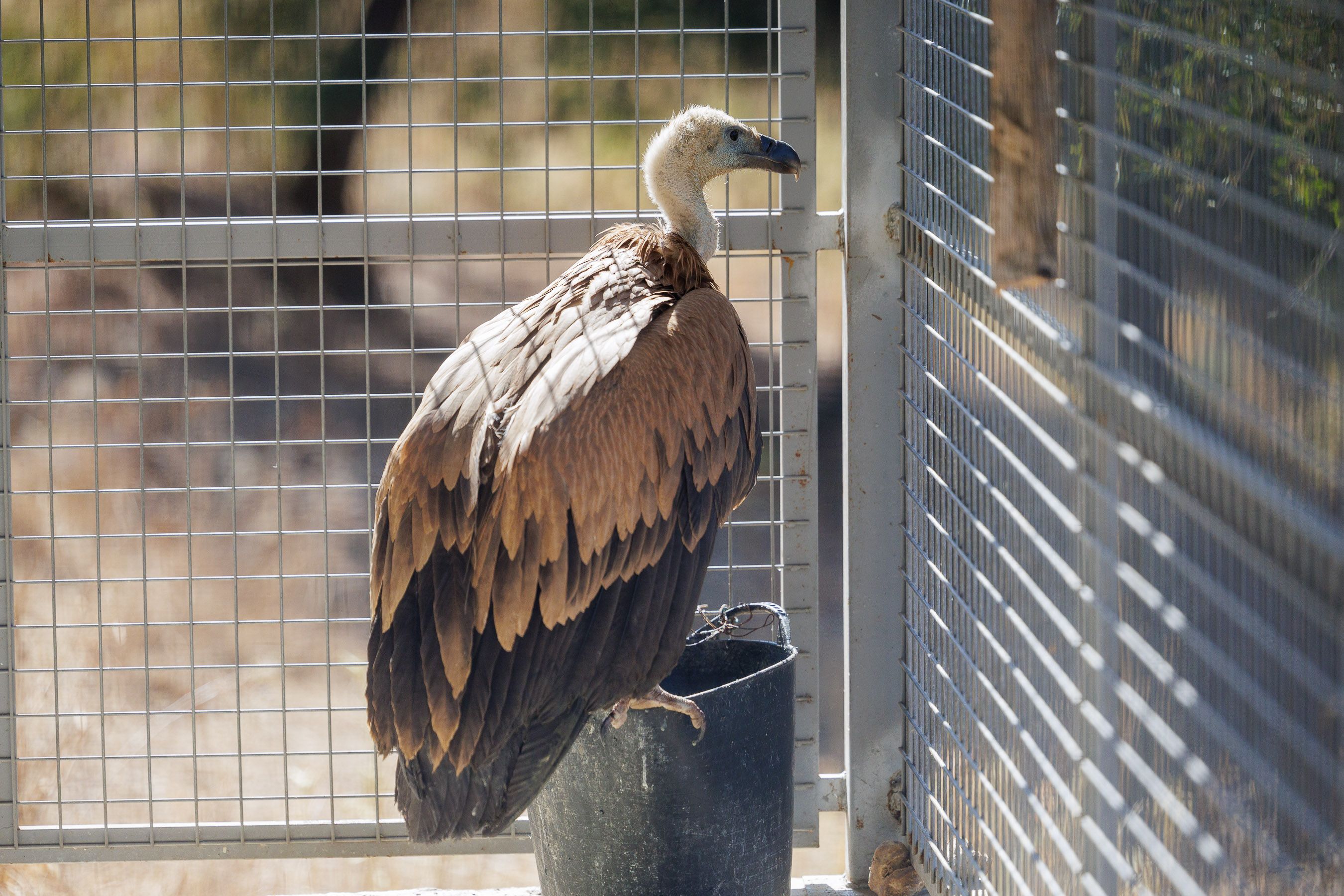 La lección continúa mientras el último buitre rescatado mete las patas en uno de los tres cubos de agua que tiene en la jaula: "Necesitan bañarse, refrescar las patas cada poco tiempo".
