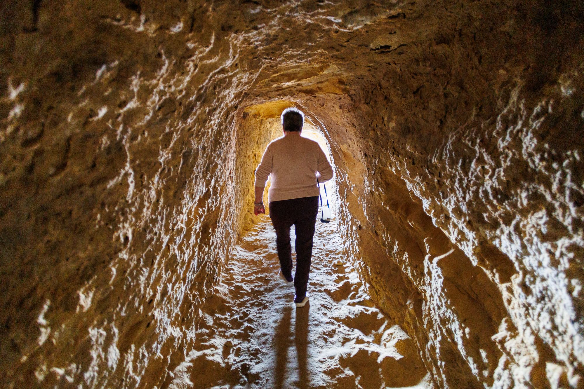 Una estrecha puerta metálica, situada al fondo del patio de vecinos, da acceso a la cueva. Para entrar hay que agacharse un poco y sortear los salientes de un pasillo cuyas paredes de piedra amenazan con deshilachar un jersey al mínimo despiste. Entre 20 y 30 metros tiene el pasillo, que Encarna recorre con una linterna con asa en la mano.
