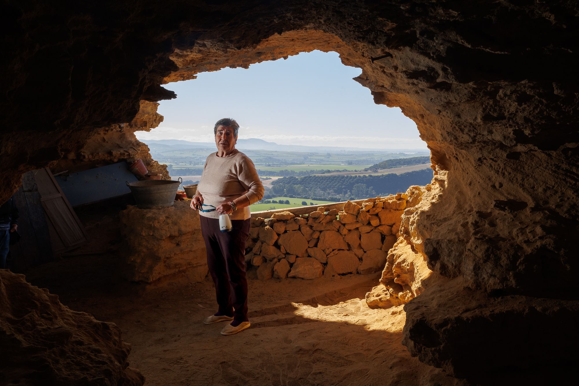 La experiencia de asomarse a la cueva que Encarna tiene en la finca donde vive, que comparte con otros dos vecinos, no es apta para personas que padecen vértigo, uno de los síntomas de la acrofobia, el miedo a las alturas. En un día soleado, se divisa justo abajo la caída de la Peña, la carretera que rodea al pueblo, y la campiña, con la Sierra al fondo.