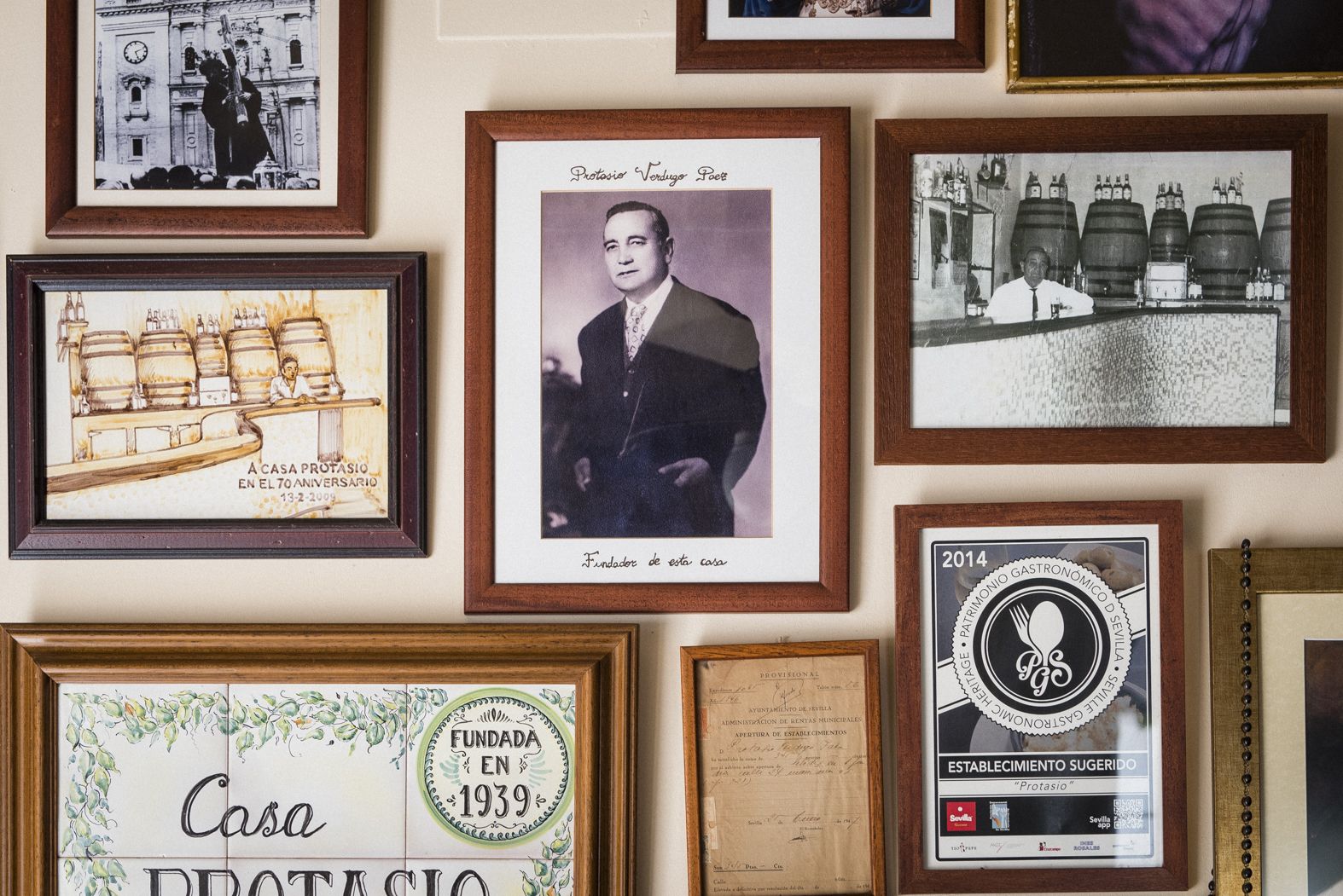 En la historia de Casa Protasio “no falta un perejil” (y nunca mejor dicho, si recordamos quién fue el primer proveedor de vinos de este despacho). Hay futbol de los dos equipos, hay flamenco del viejo y del nuevo, hay barrio de jardines y plazas, hay balas de la Guerra Civil, hay fotografías analógicas y digitales y recortes de periódico, hay vinos del Aljarafe y hay cante jondo, hay vecinos que saludan al pasar: retales de historia que se enredan cual caracoles en sus mallas.