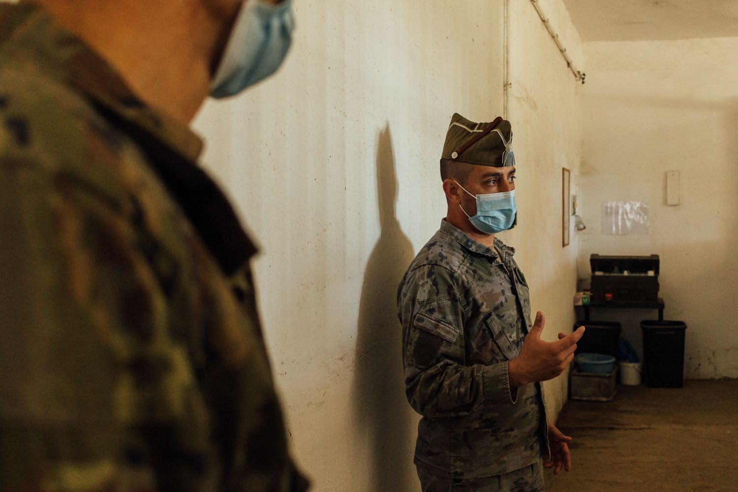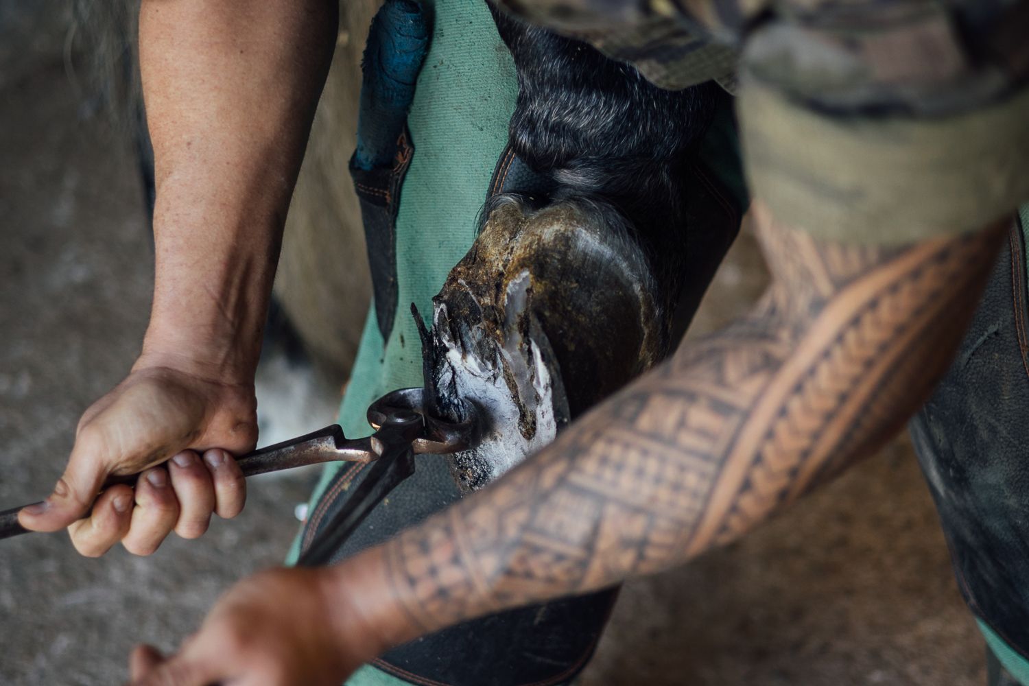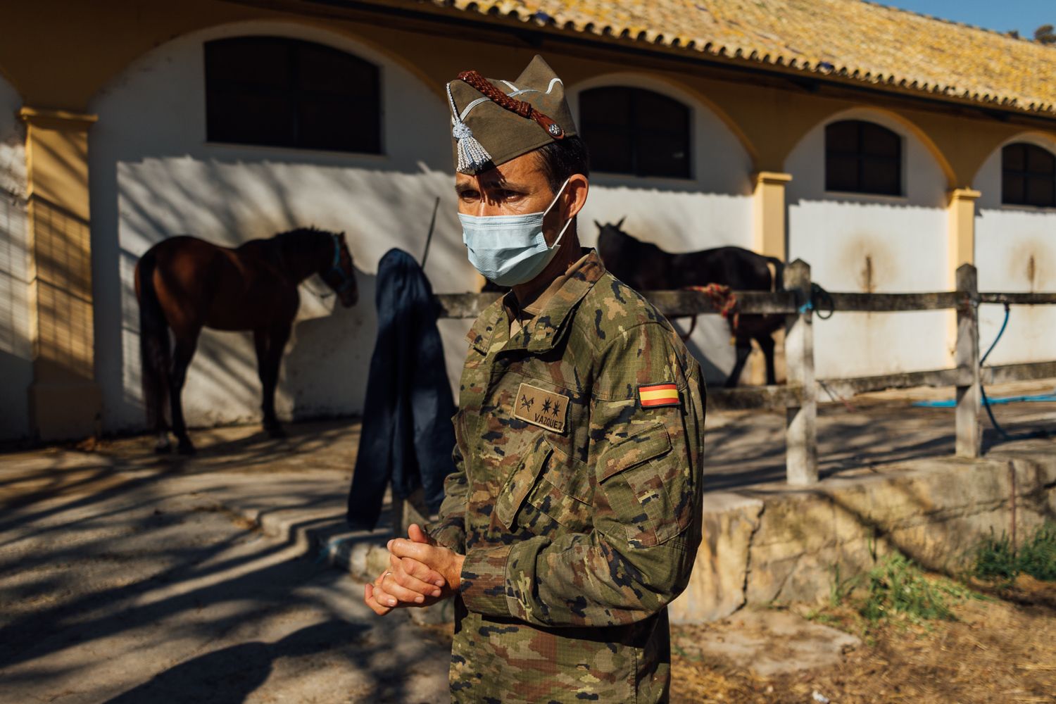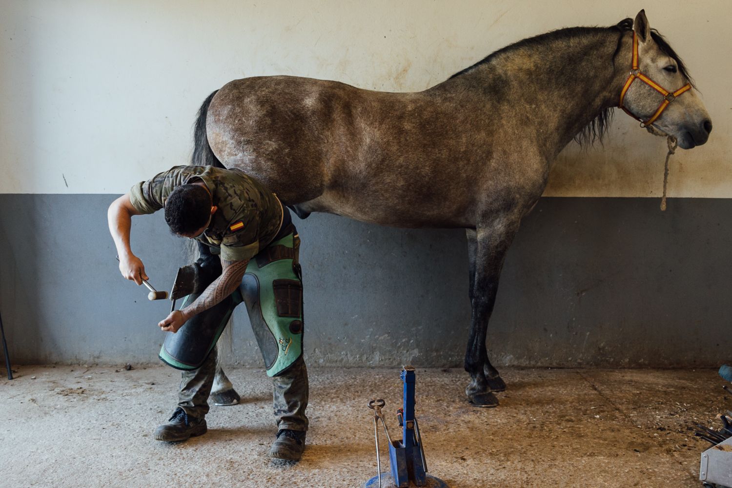 El relincho de los caballos irrumpe en el lugar mientras la plantilla continúa con sus quehaceres. En una sala, Vicente, natural de Jerez, le cambia la herradura a un equino. El cabo lleva 21 años como herrador. “Al mes y medio se las ponemos para que no pierda su aplomo y vaya lo mejor posible en su trabajo”, comenta concentrado.