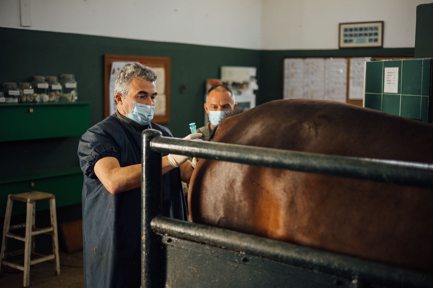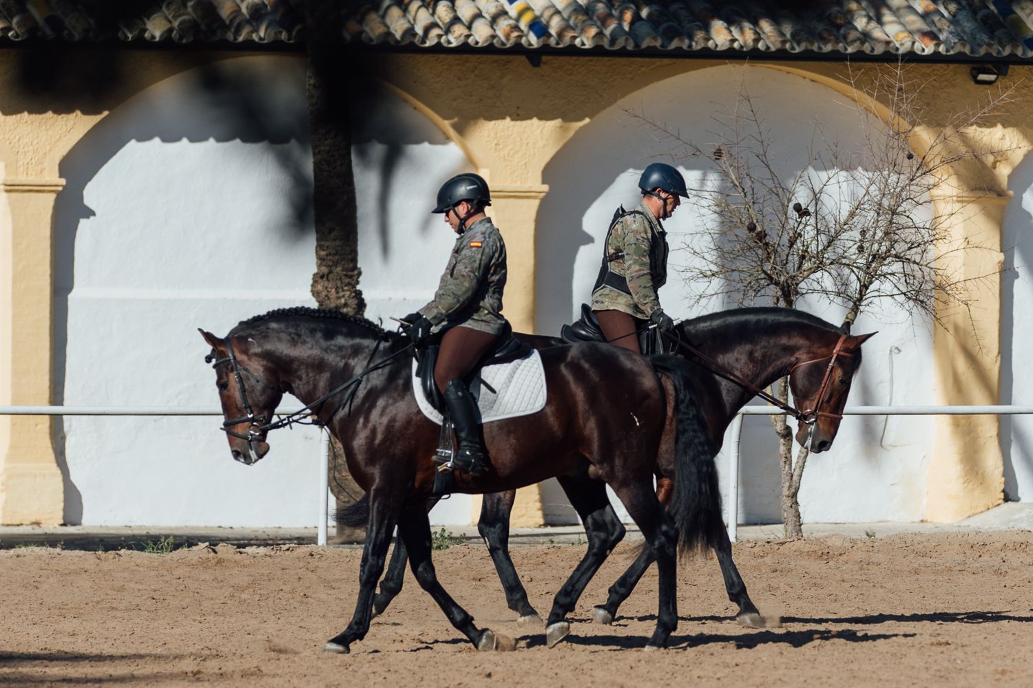 Los equinos participan en las misiones de orden público, de escolta a la familia real o de vigilancia junto a la Guardia Civil. Pero, además de dotar caballos, el centro ofrece un servicio público a los pequeños y medianos ganaderos para que puedan cubrir sus yeguas. No es extraño que los interesados visiten la cuadra de sementales del cortijo para verlos y seleccionarlos. “Pueden solicitarlo, se realiza la extracción, se envía y le llega en 24 horas”, detalla Daniel.