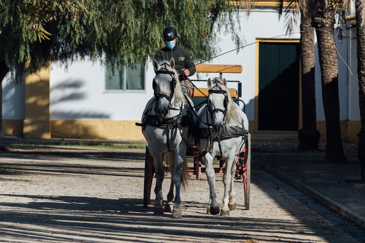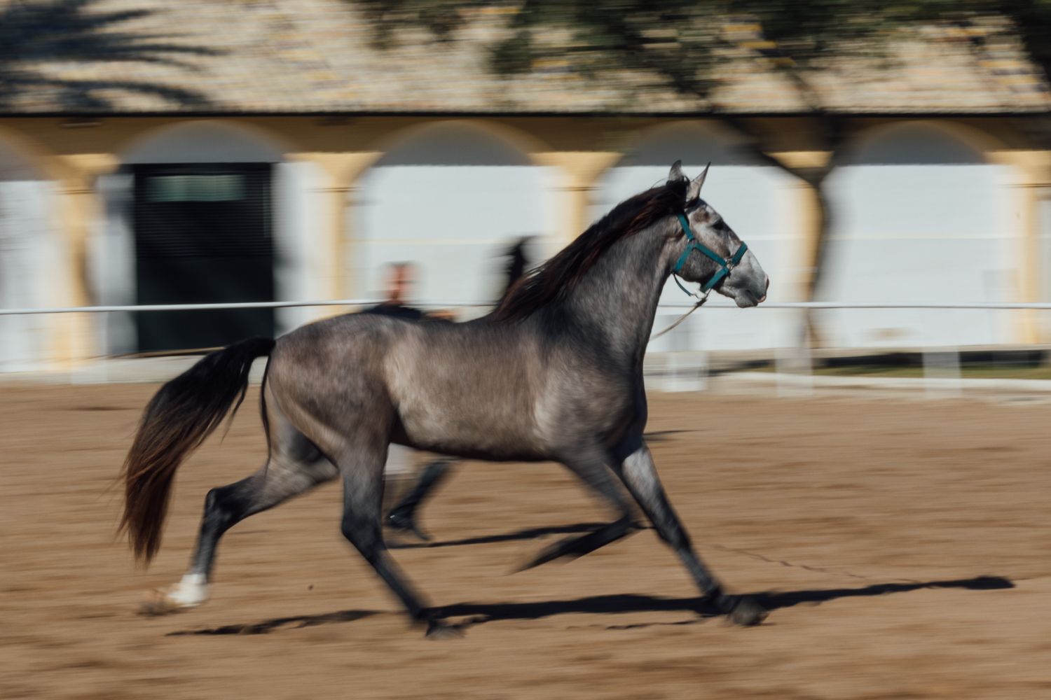La brisa mañanera mece la crin de varios potros y sementales. Al galope, trabajan enganchados o montados, mejoran sus habilidades bajo la atenta mirada de los jinetes. “Sois los altos caballos inmortales, hijos del sol y espumas musicales”, recitaría Rafael Alberti si se detuviera ante los equinos andaluces a los que dedicó sus versos.