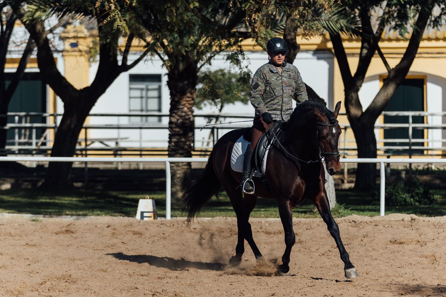 “Estos potros tienen tres años, se están iniciando en su fase de doma”, comenta el teniente coronel Daniel Vázquez Cortejoso señalando el picadero. El vallisoletano lleva cinco años como Jefe de la Unidad de Ganado del centro que se dedica principalmente a la cría de caballos de pura raza española y pura raza árabe.