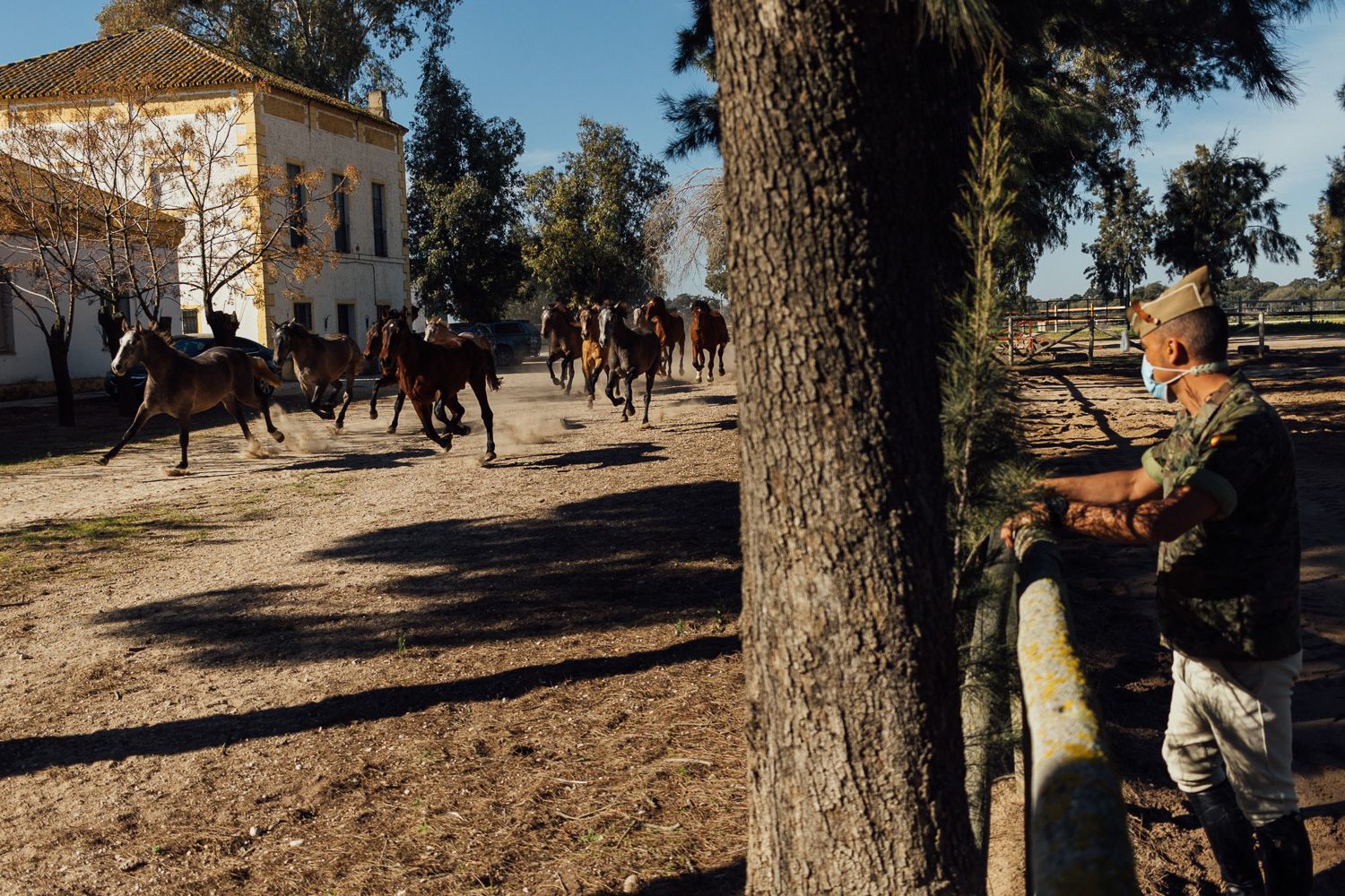 Un potro se familiariza con la cuerda al mismo tiempo que Daniel desgrana las funciones de los equinos. “Los caballos que escoltan a sus majestades los Reyes el 12 de octubre son nacidos en Jerez, también prestan guardia en el Palacio Real cuando hay un acto solemne”, comenta. A su vez, es habitual cruzarse en Sevilla con agentes de la Policía Nacional montados en estos animales, muchos de ellos criados en Garrapilos.
