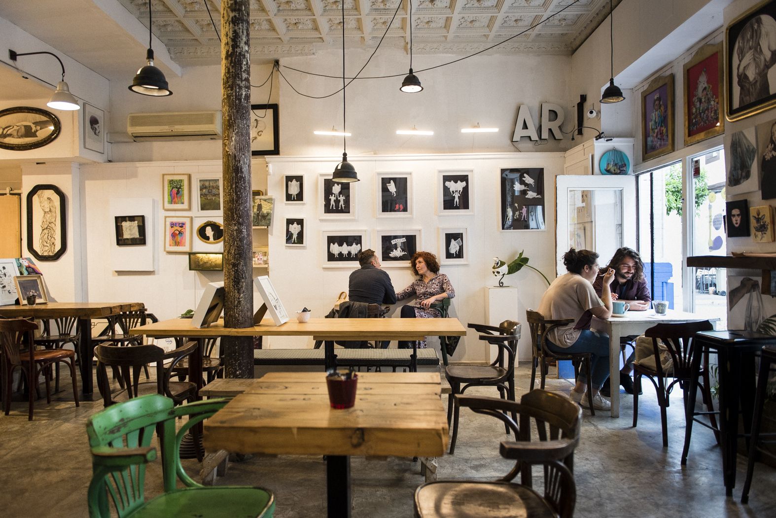 La mudanza al espacio actual vino motivada por la mala condición del anterior local y por una subida del alquiler a la que se negaron, así que encontraron este espacio donde además añadieron una cafetería, una idea que tenían en mente. “Lo más importante de este cambio han sido las relaciones personales, entablo más relación con el público. A mí me gusta ir de mesa en mesa hablando con la gente”. Además, también ha cambiado el consumo de arte: “Es curioso que la venta de arte se hace más sencilla, porque aquí estás como en el salón de tu casa, rodeado de tus cuadros y tus libros. Esta sensación hace que la gente le pierda el miedo a preguntar por el precio de una obra y te enamoras más fácilmente de ella. He formado aquí a mucho pequeño coleccionista”.