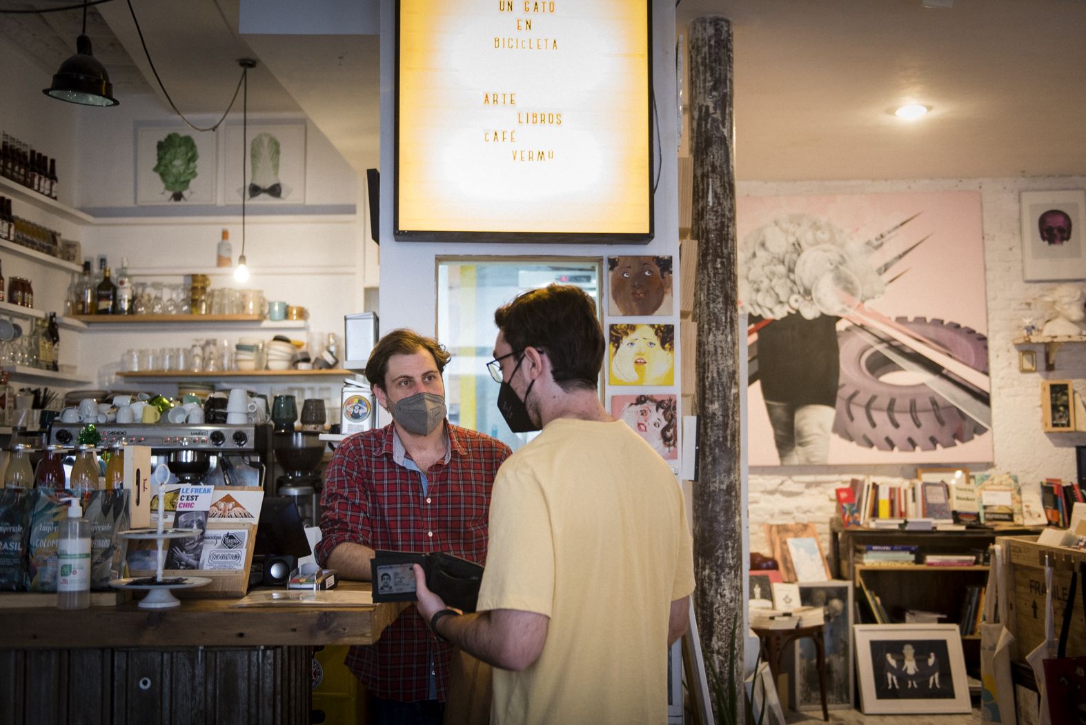 Jesús es una persona chispeante y generosa, que escucha y comparte sus ideas con todos sus clientes y amigos (aunque en Un gato en bicicleta casi no hay diferencia entre estas dos palabras). Esta vitalidad y ganas de hacer cosas nuevas le ha llevado a abrir recientemente Berlín Galería, una galería de arte contemporáneo situada a tan solo dos pasos, y aun así sigue teniendo ganas de seguir inventándose cosas, de sumarse e improvisar las locuras que tiene en la cabeza. También le encantaría trabajar en la proyección artística de los artistas en los que confía, incluso a nivel internacional: “Yo creo que los artistas necesitan mayor apoyo y que puedan vivir del arte y disfrutar haciendo proyectos, es un subidón cuando les dices que disponen de un espacio para hacer lo que quieran, y me gustaría llevar esto más allá”. “Yo disfruto mucho con la alegría ajena, es algo que no puedo evitar, será que soy muy de pueblo”, añade entre más risas.