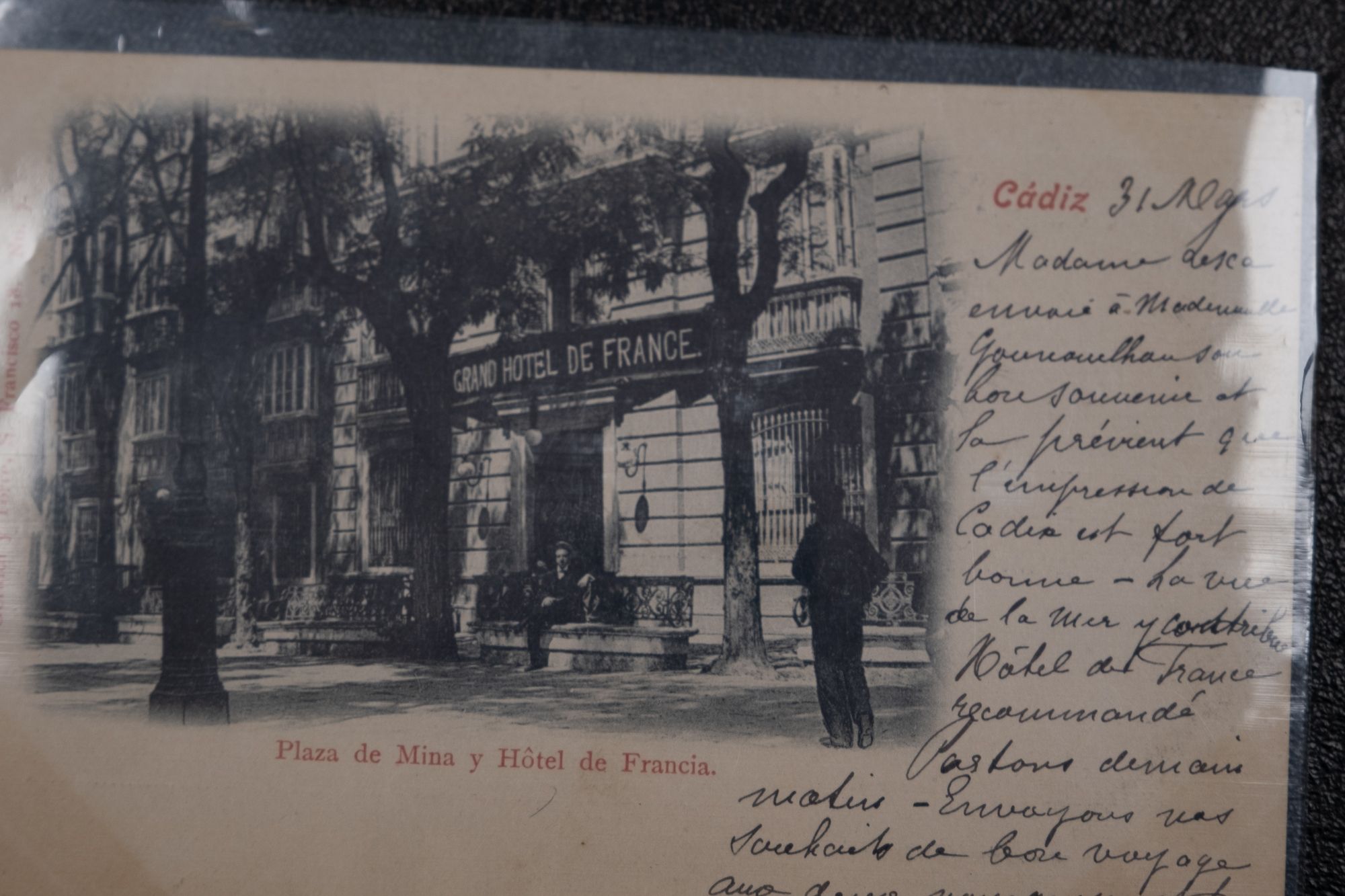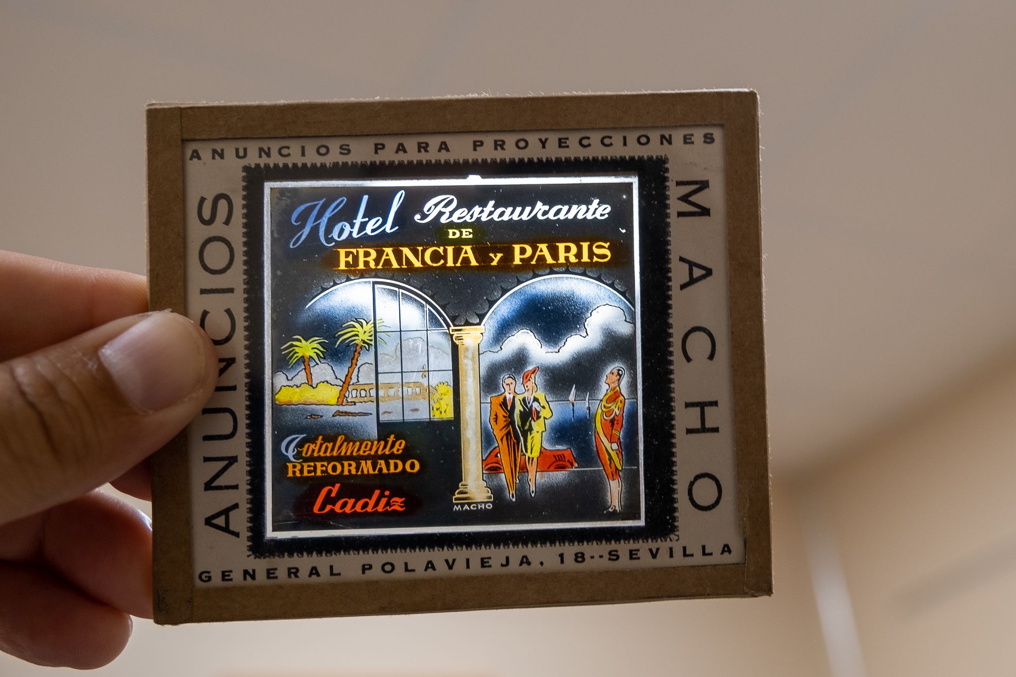 Entre recuerdos en blanco y negro, Victoria se detiene en un tríptico publicitario de 1890 y, después, enseña un anuncio para proyecciones de los que salían en el Nodo. Reliquias que guarda con entusiasmo entre “una sartén muy rara” de la antigua cocina, una máquina para troquelar los cheques y una pesada calculadora de los años 40. Los restos del pasado viven más que nunca en este hotel cuyo nombre es un misterio. “Me figuro que será porque Francia y Cádiz iba a quedar muy raro, y ya entonces estaba en San Sebastián el hotel de Londres y de Inglaterra, que sigue existiendo, donde se quedó Isabel II cuando iba camino del exilio. Será un poco por influencia”, intuye.