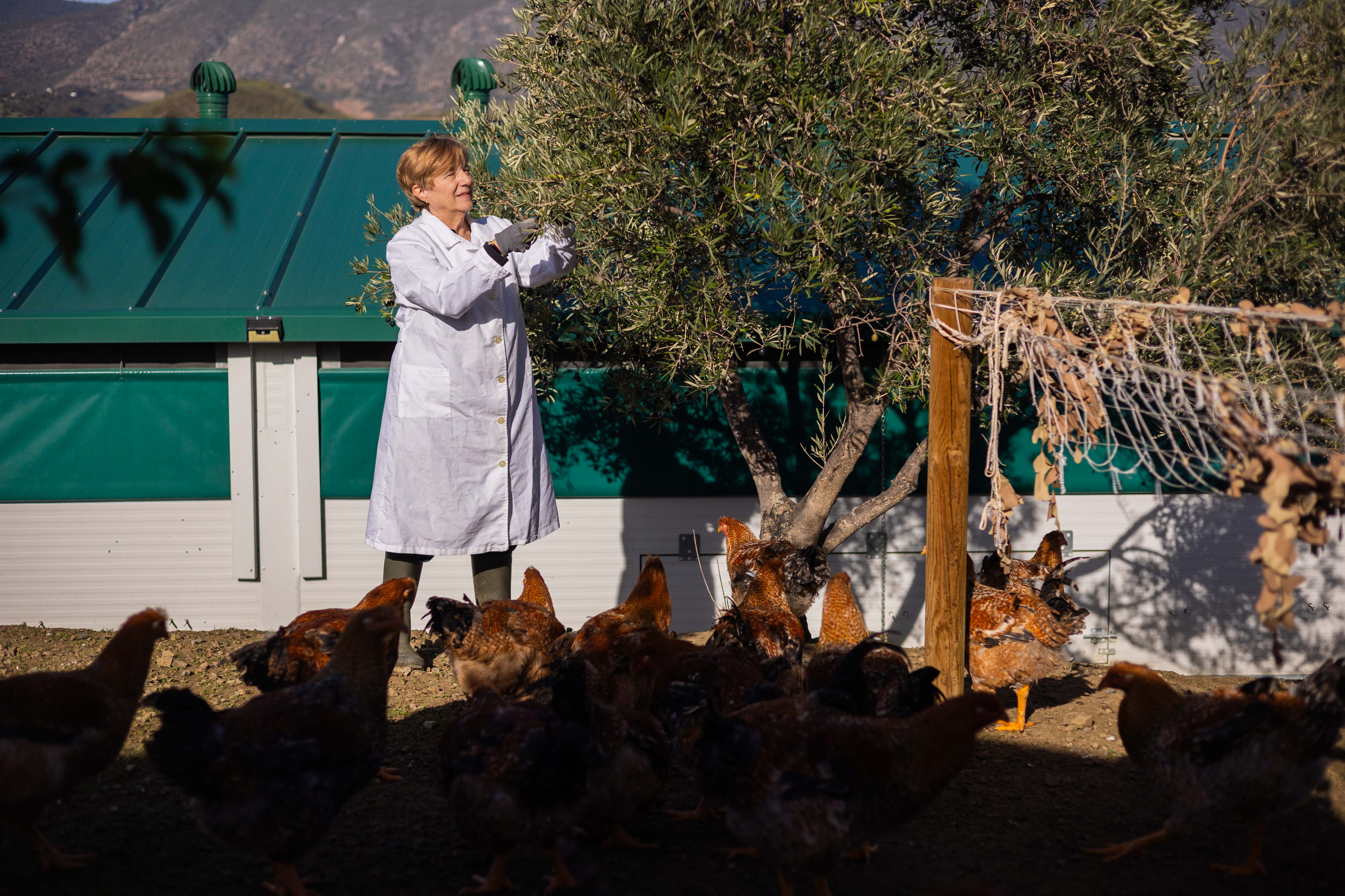 Antes de ese último momento, crecen en libertad en la finca serrana con 4,6 hectáreas, de las que dos están consagradas a las aves. Su alimentación es tan natural que la gerente les echa a diario aceitunas negras de los olivos de la zona. “Mira, mira”, avisa mientras los gallos gigantes acuden al lanzamiento. Las pelan con el pico en milésimas. Primero se comen la carne y luego, también, el hueso.