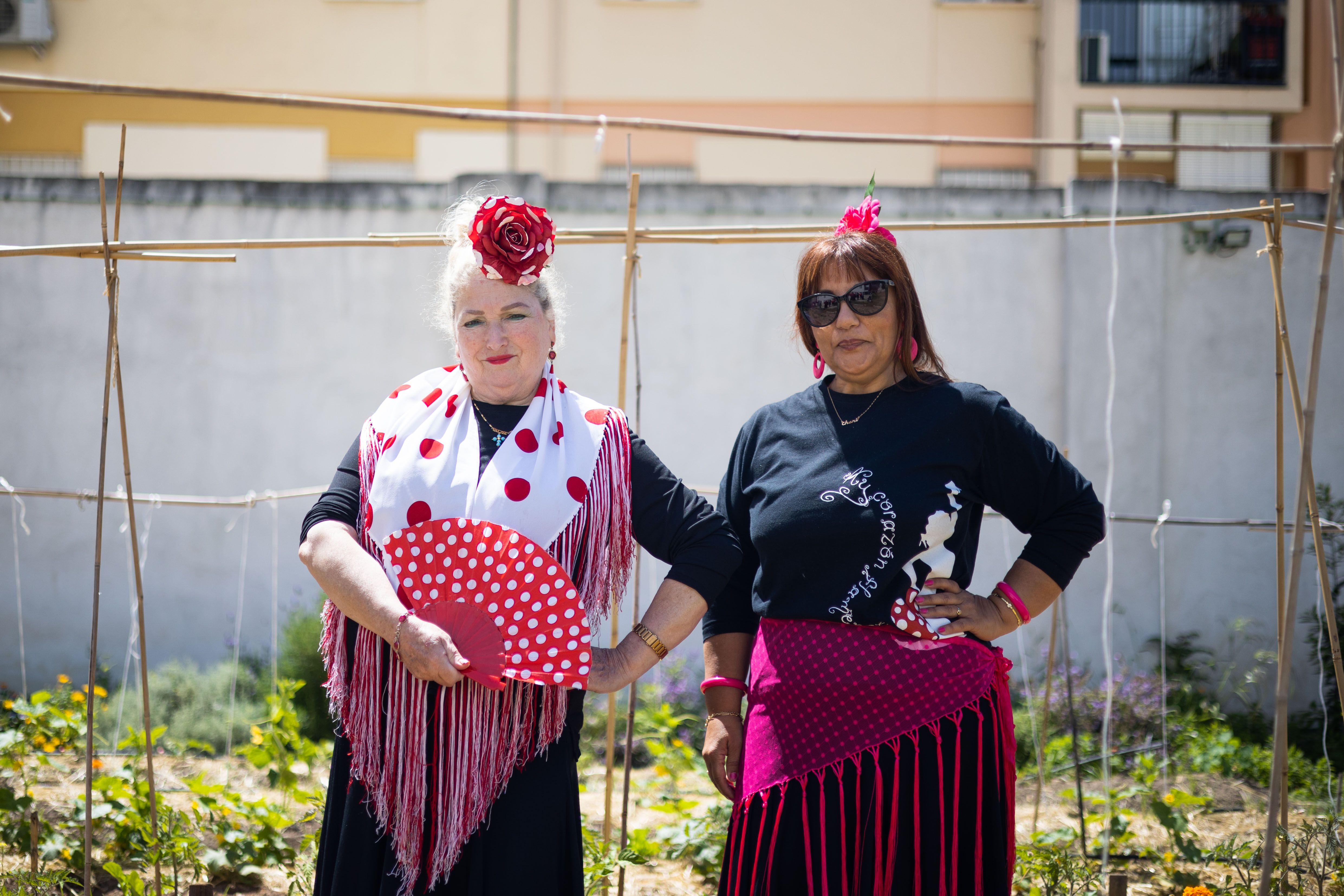 A las 12 de la mañana, el patio del Centro Cívico Hogar San Fernando de Sevilla ya huele a feria. Las mujeres del taller de huerto están preparando una ensalada de flores plantadas por ellas mismas y las primeras sevillanas resuenan al ritmo que cortan lechugas y rábanos. Capuchinas, caléndulas y un traqueteo de fiambreras que avisa de que las croquetas, chacinas y tortillas están al caer. Hoy es un día especial porque se celebra la pre Feria de Abril.