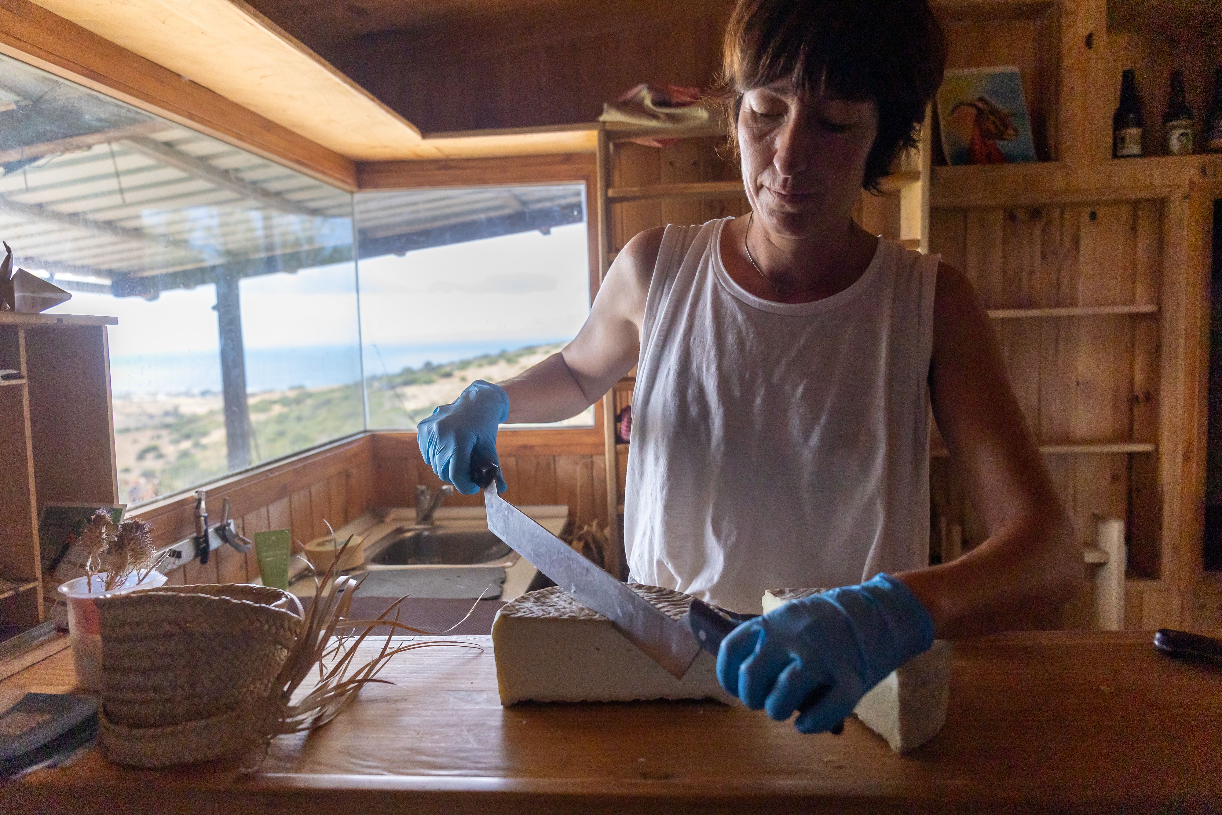 La quesería lleva por nombre El Cabrero y fue el proyecto que iniciaron la veterinaria sevillana Inma Bendala y Jesús Pelayo, un tarifeño que se dedicaba a la construcción antes de emprender en el mundo de los quesos de autor. Suena Man gave names to all the animals (El hombre que puso nombre a todos los animales) de Bob Dylan. Desde el emparrado se ve el cerro de San Bartolomé y, a la espalda, la sierra llega hasta Cabo Camarinal.
