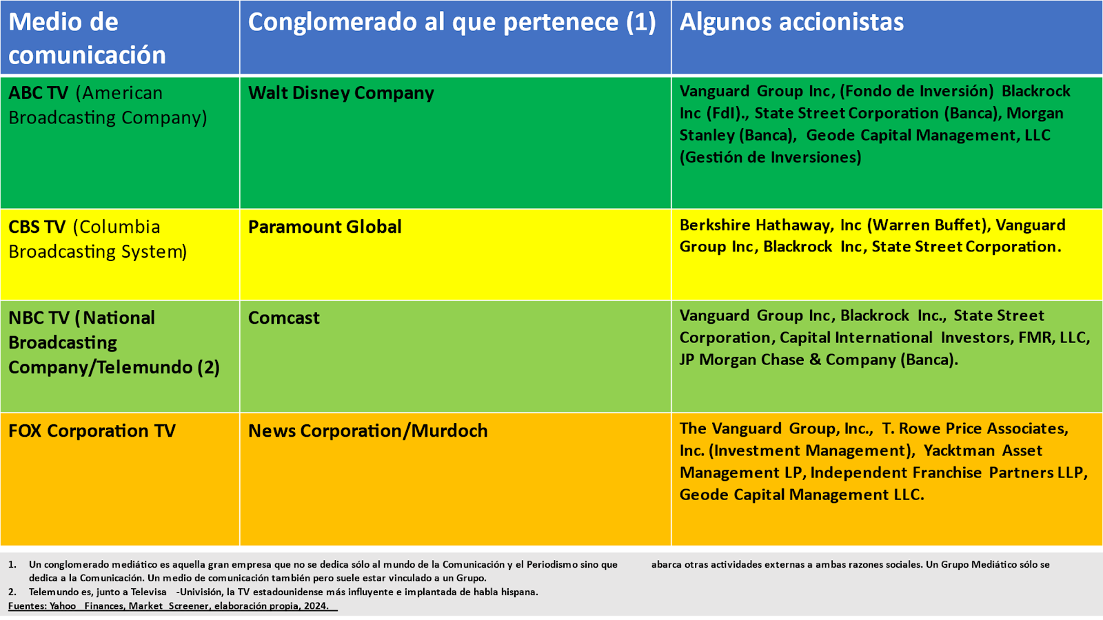 En EEUU -que tanto presume de libertad- hace bastantes años (en 1976) que se creó un portal -Project Censored- que da cuenta de noticias censuradas. Por otra parte, todas sus grandes televisiones están en manos de empresas no específicas de comunicación, lo demuestro en un cuadro que adjunto:
